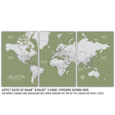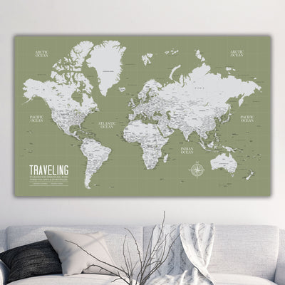 Highly customized, highly detailed Push Pin World Travel Map with light grey on a Sage Background. Map features current, up-to-date countries. Great clarity with excellent city and country details, map is READY to HANG. No additional framing necessary. Foam-like backing under our special, blended canvas ensures your pins will stick and stay intact.