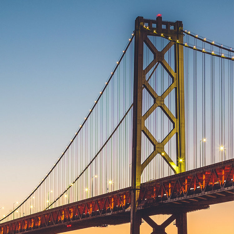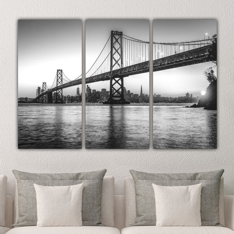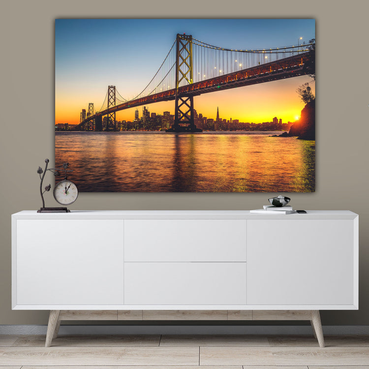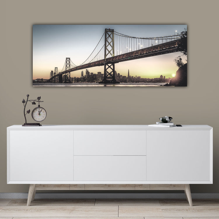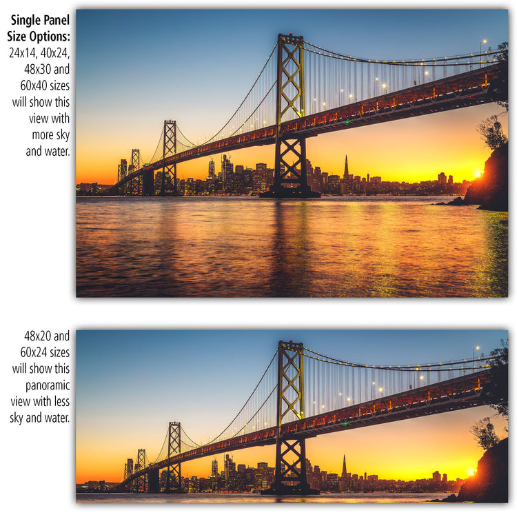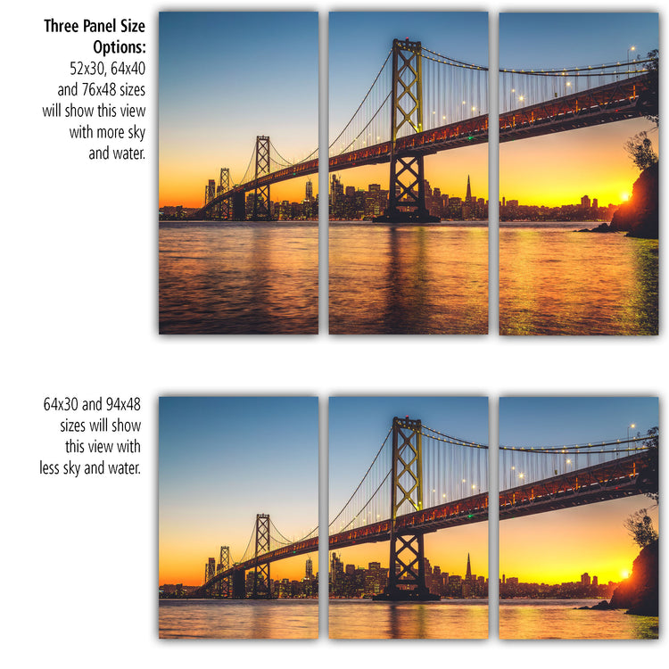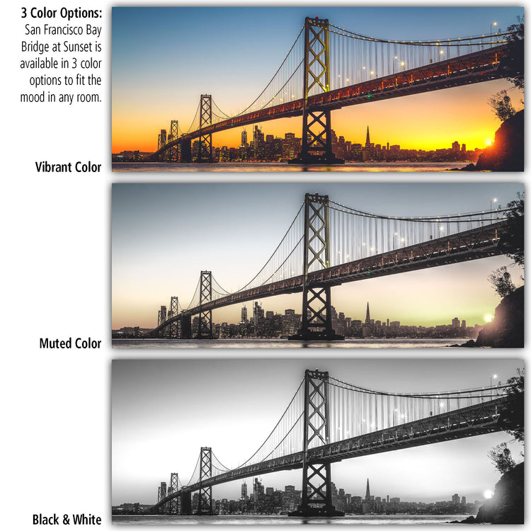 A beautiful sunset view of the San Francisco-Oakland Bay Bridge. Available in 3-Panel sizes up to almost 8' wide, and Single-Panel sizes up to 5' wide. A variety of sizes to fit any wall, and in 3 great color options: vibrant color, muted color and black & white. Perfect for anyone living in the bay area and all those who left their hearts in San Francisco. Makes a great gift.