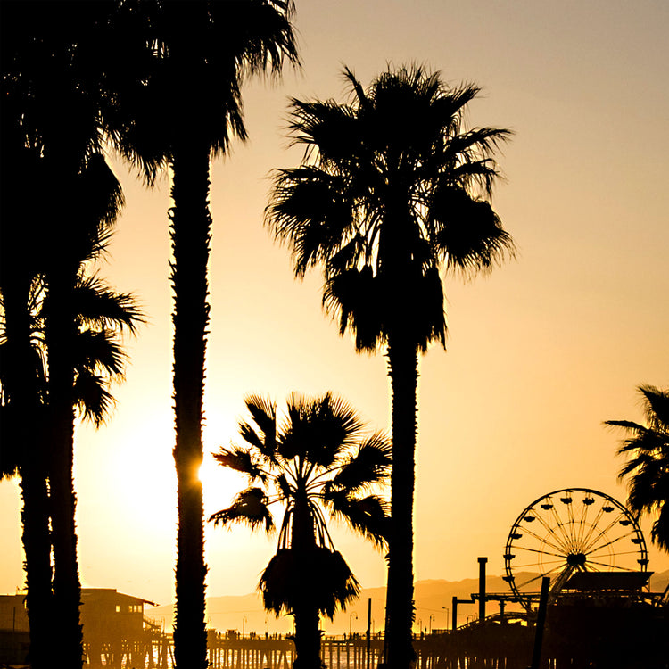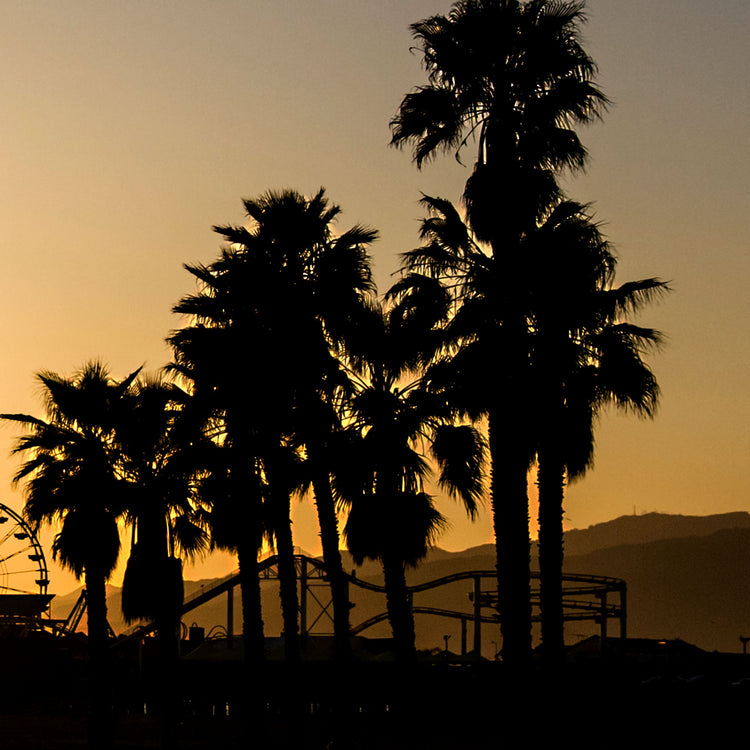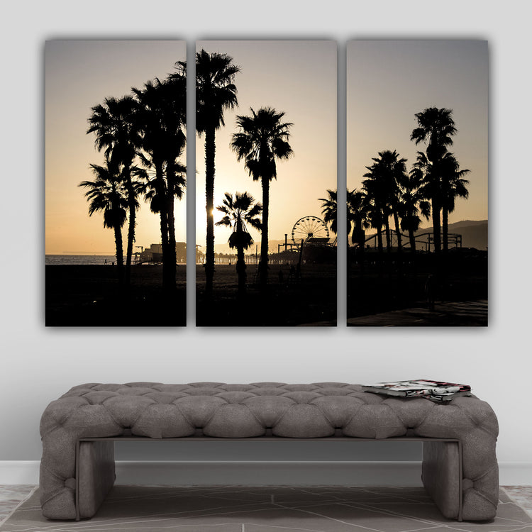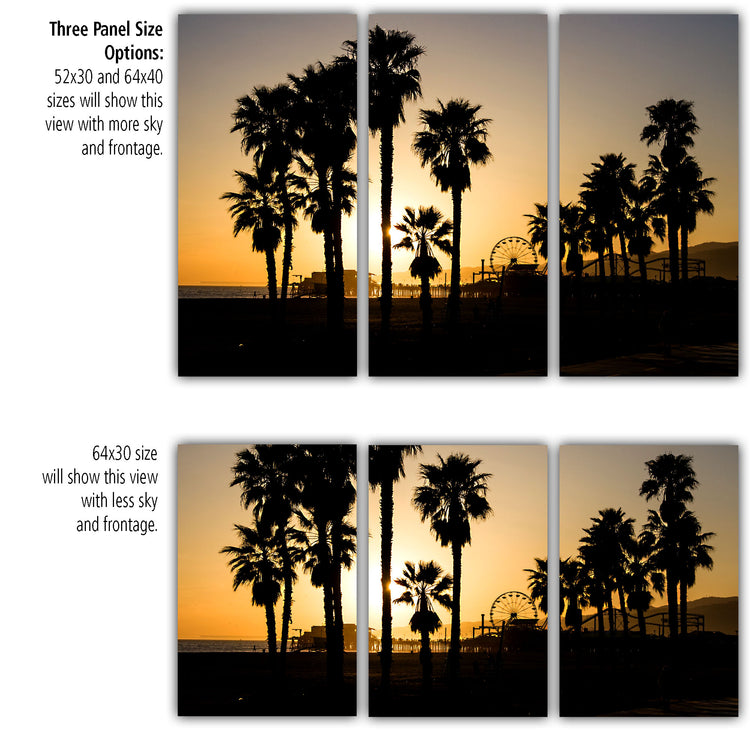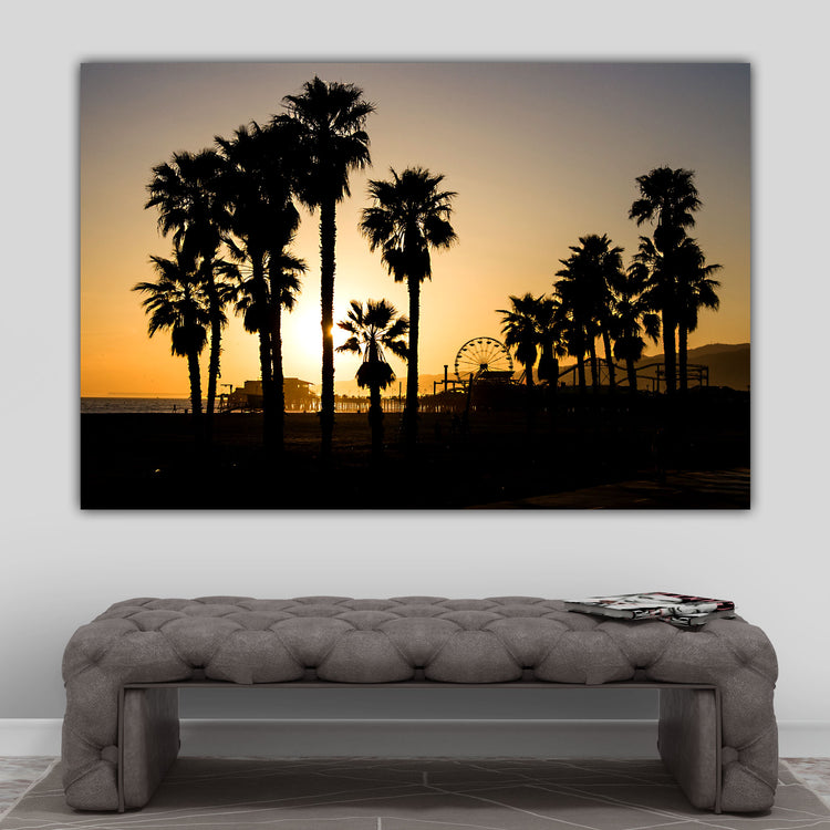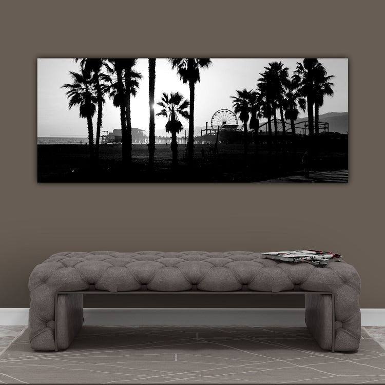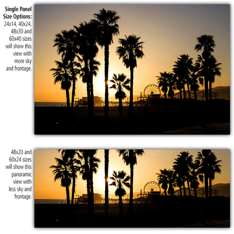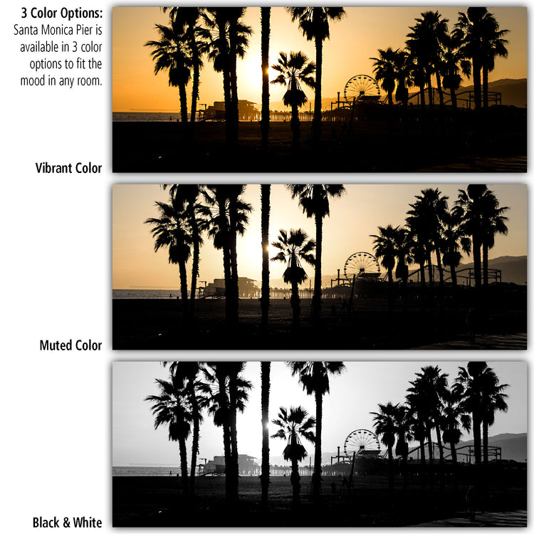 The famous Santa Monica Pier and classic California palm trees all silhouetted against a gorgeous ocean sunset. Available in 3-Panel sizes up to almost 8' wide, and Single-Panel sizes up to 5' wide. A variety of sizes to fit any wall. Three great color options, vibrant color, muted color and black & white. This canvas will capture the heart of anyone who loves the west coast and has memories of visiting this iconic pier. Makes a great gift.