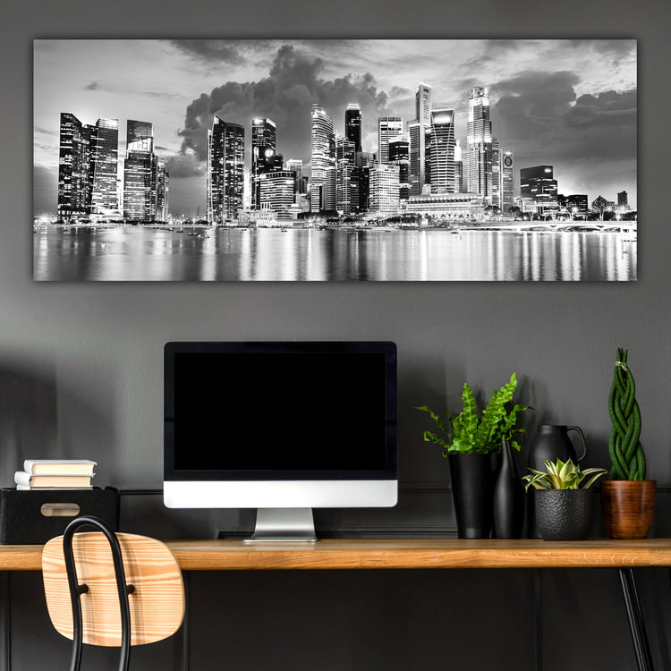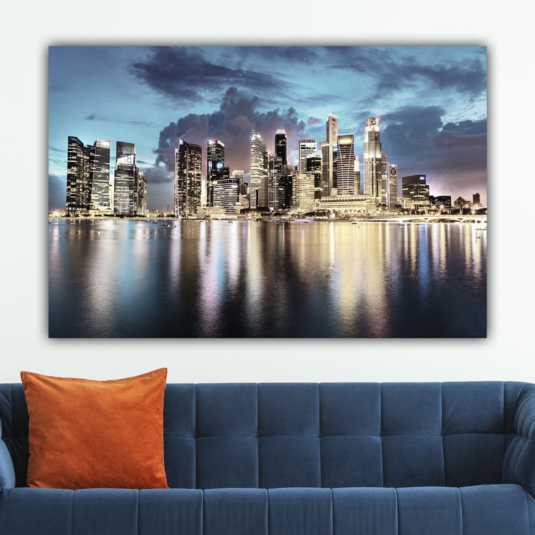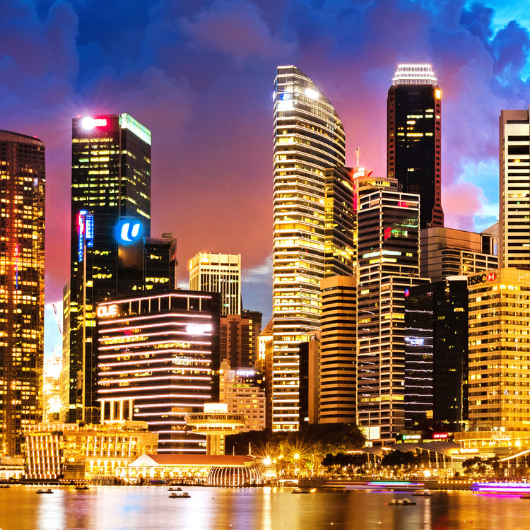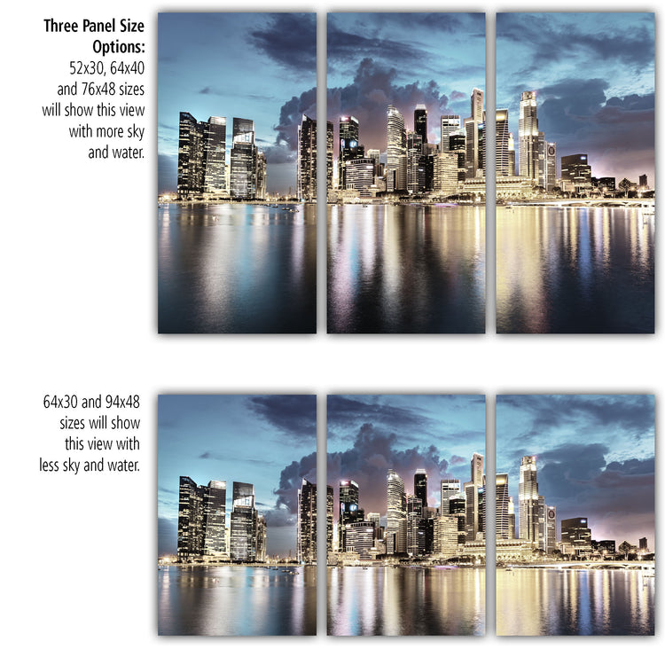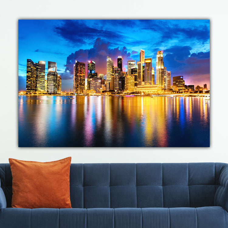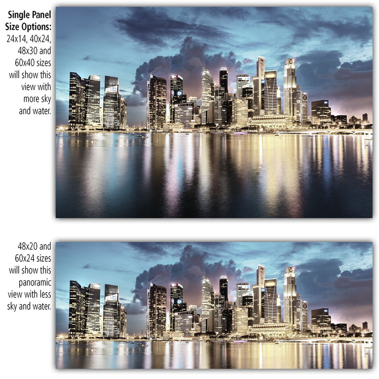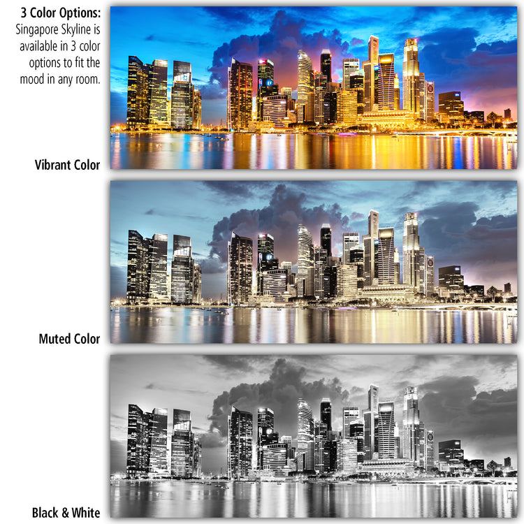 A brilliant sunset view of the Singapore skyline on premium canvas. Available in 3-Panel sizes up to almost 8' wide, and Single-Panel sizes up to 5' wide. A variety of sizes to fit any wall. Three great color option, vibrant color, muted color and black & white will capture the heart of anyone who loves this magnificent city.