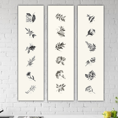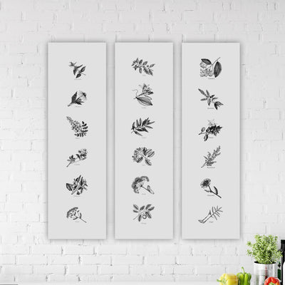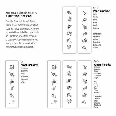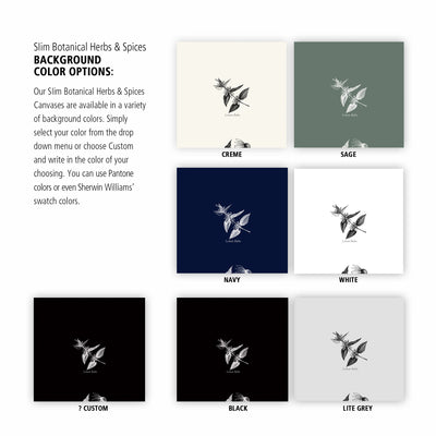 Botanical Herbs and Spices complement your kitchen or dining room decor with a simplistic, clean look. Available in 6 colors shown or we can customize background colors to your preference. Unique skinny, vertical design is available as a set of three or as individual prints. Hand drawn pen and ink illustrations are great for your modern farmhouse or contemporary home style. All plants are labeled. Choose from our premium Gallery Wrapped option for ready to hang wall art, or choose the ROLLED options for those who want to frame themselves.