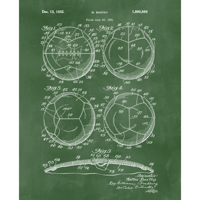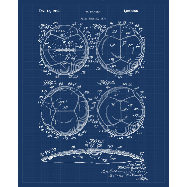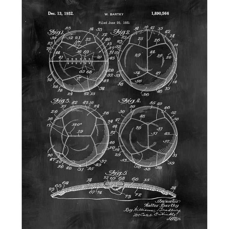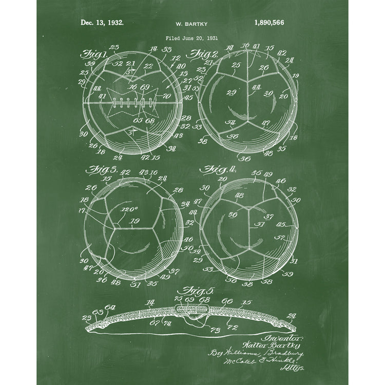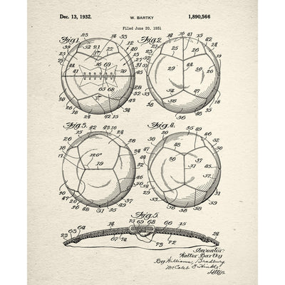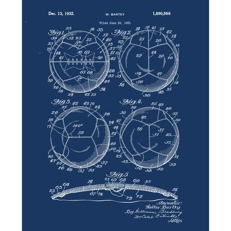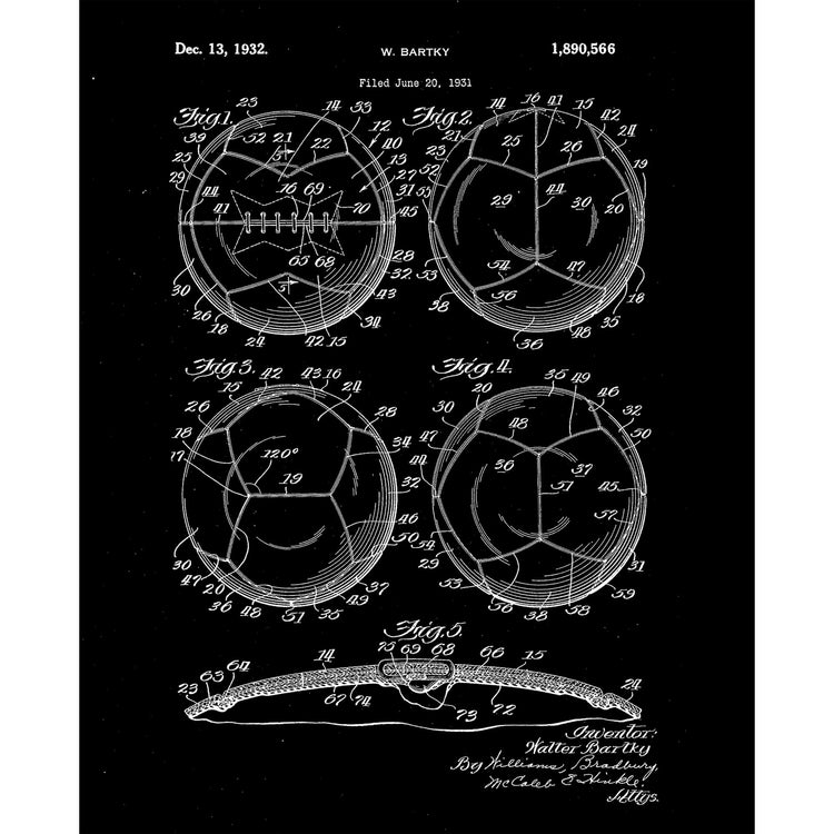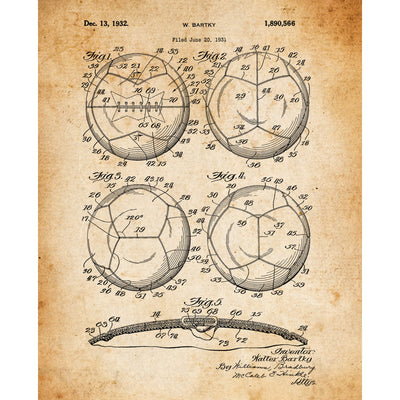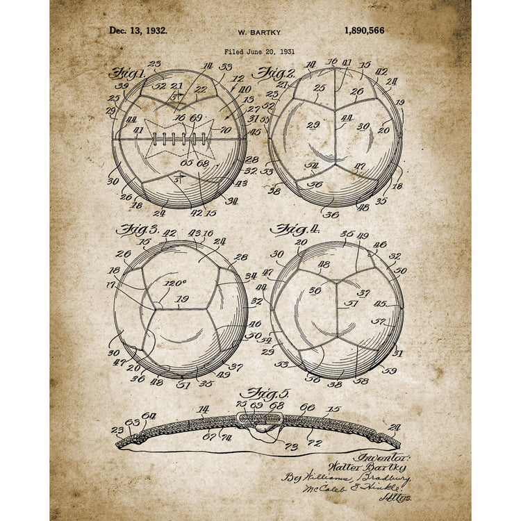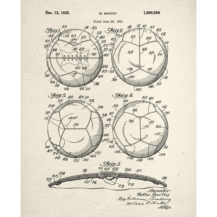 Patent for vintage Soccer Ball covering dating from 1932, filed by inventor Walter Bartky. This vintage patent art has been restored and digitally enhanced to maintain integrity of the original document.