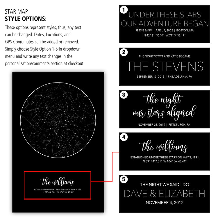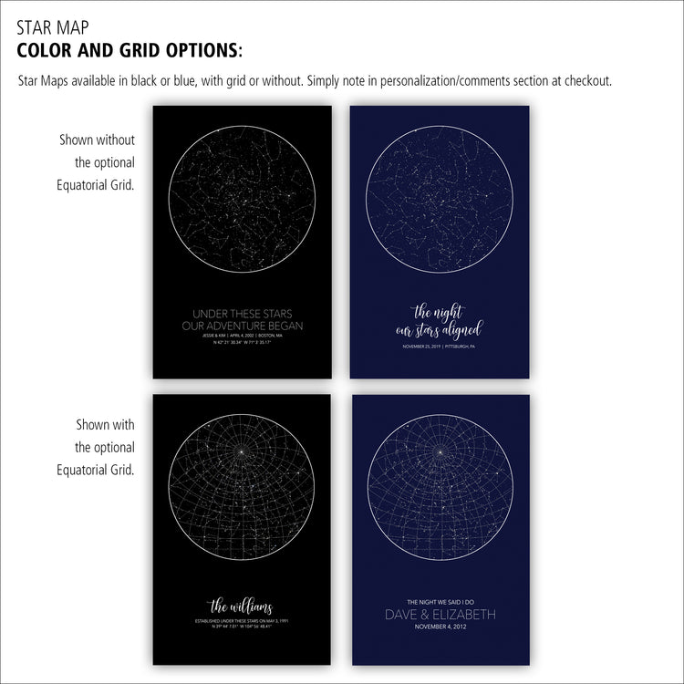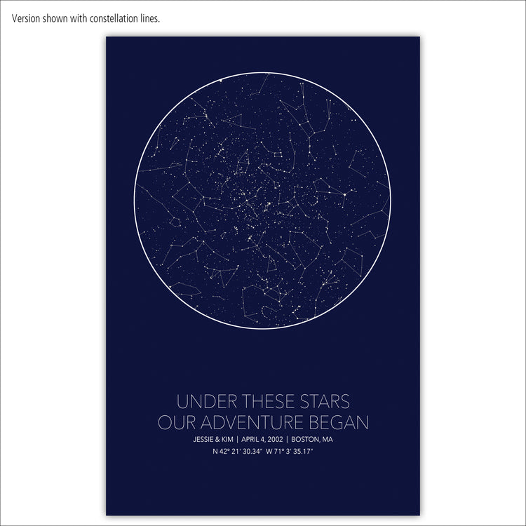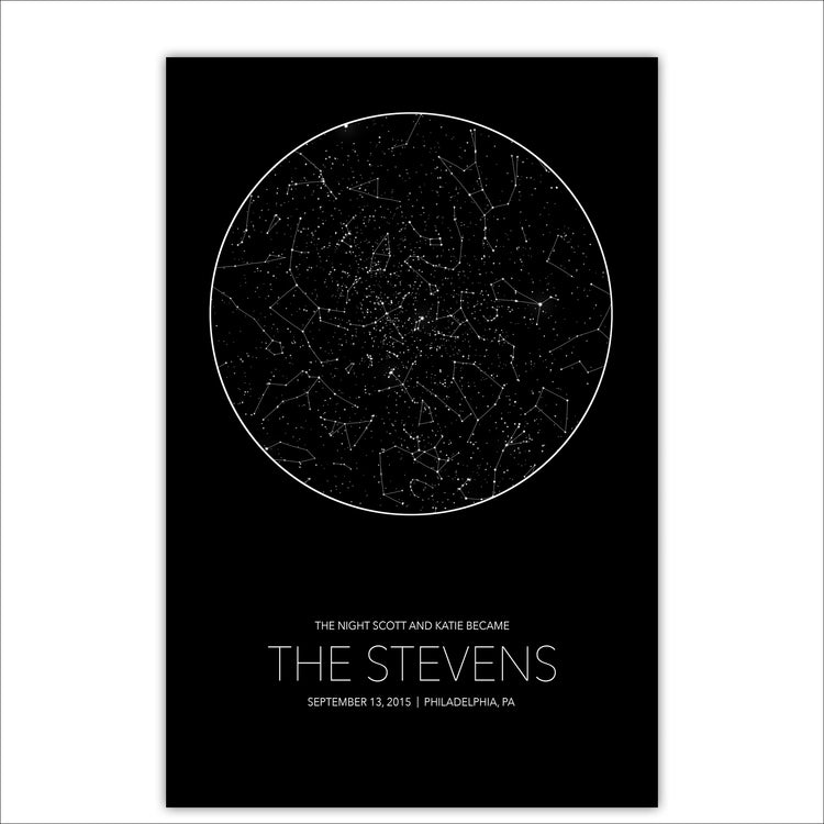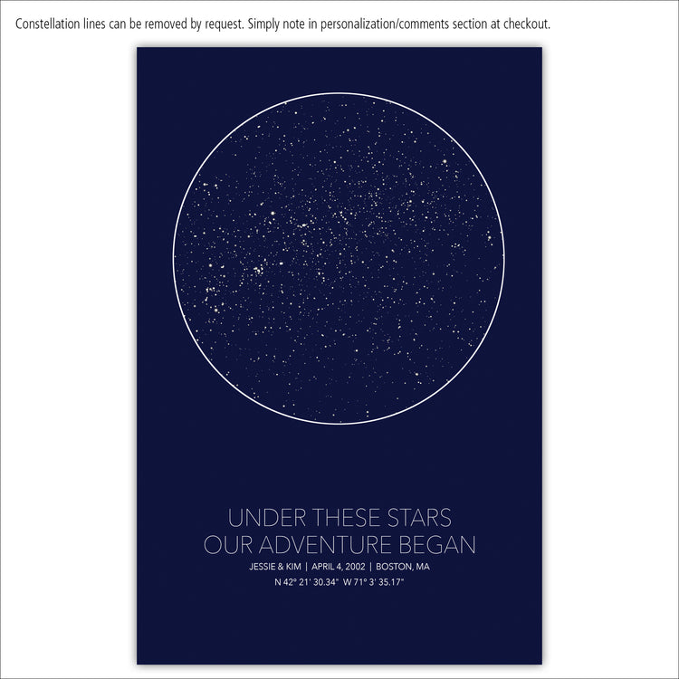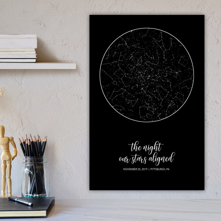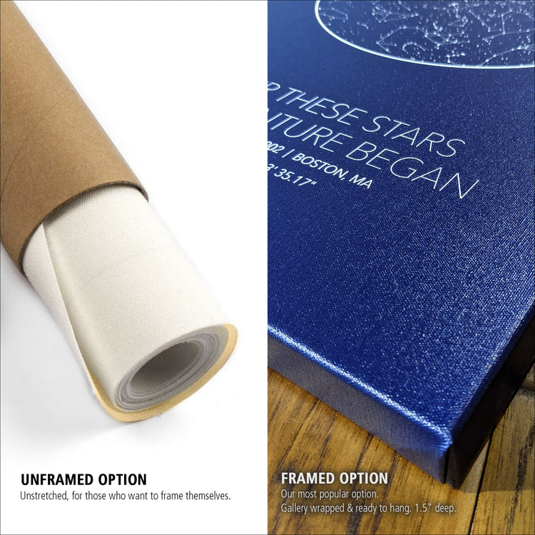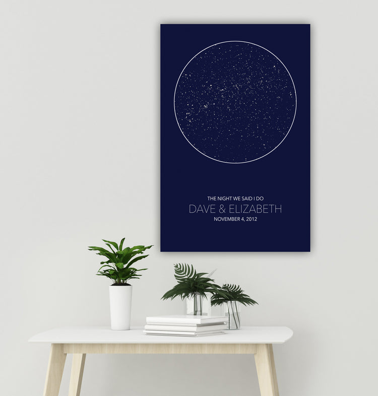 Our Large Star Map is ready to hang, framed gallery wrap canvas and shows the stars specific to the location, date and time of your choosing. It's one of the most customizable Star Maps you'll find. Looking for a unique Wedding, Anniversary, Birthday or newborn gift? Give the gift of the stars to commemorate that special night.