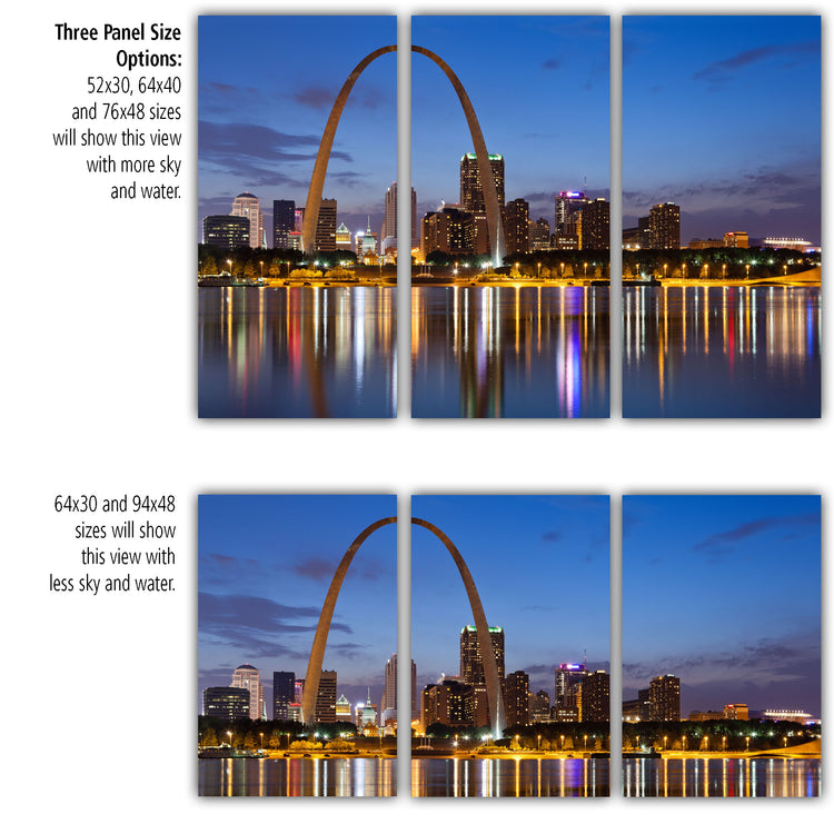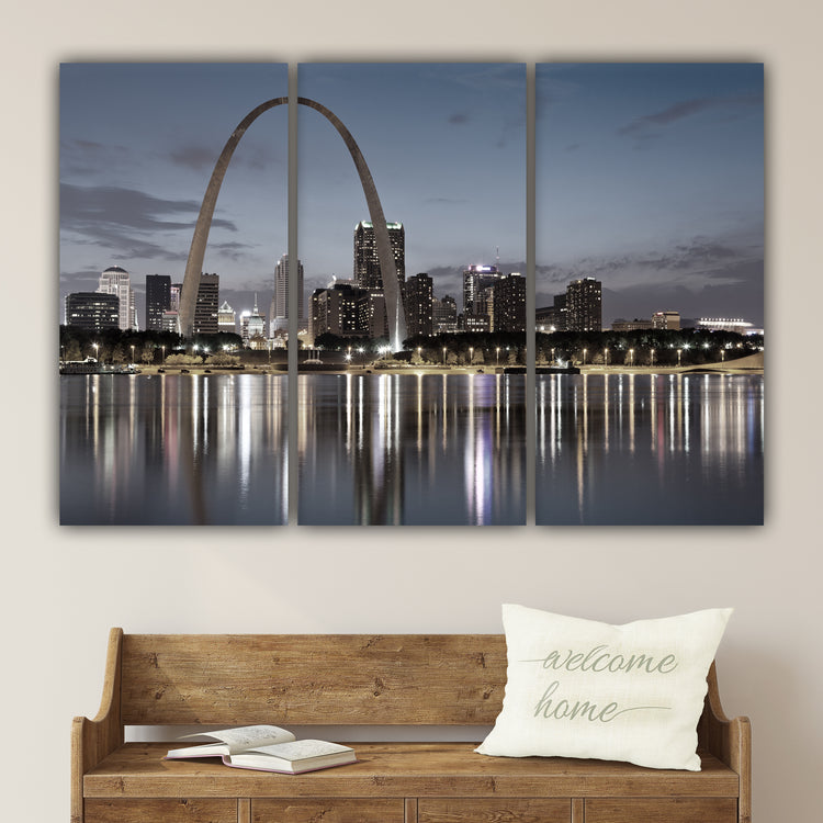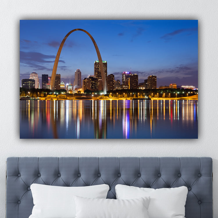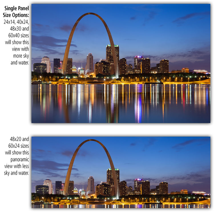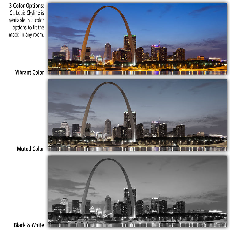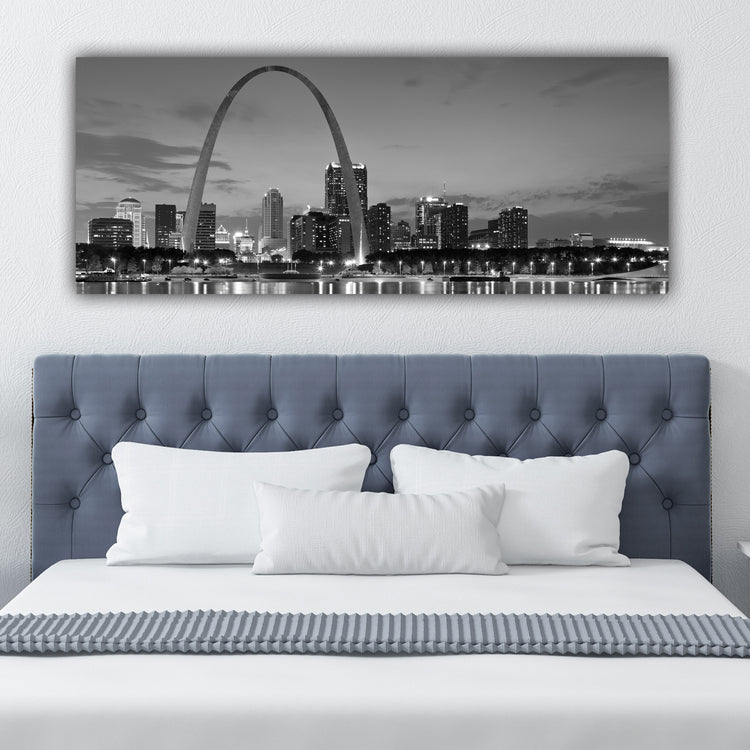 Striking night time photo of the St. Louis skyline lit up behind the Gateway Arch on premium canvas. The Saint Louis Gateway arch is located in the Gateway Arch National Park. Available in 3-Panel sizes up to almost 8' wide, and Single-Panel sizes up to 5' wide. A variety of sizes to fit any wall. Three great color option, vibrant color, muted color and black & white will capture the heart of anyone who loves this magnificent city. Makes a great gift.