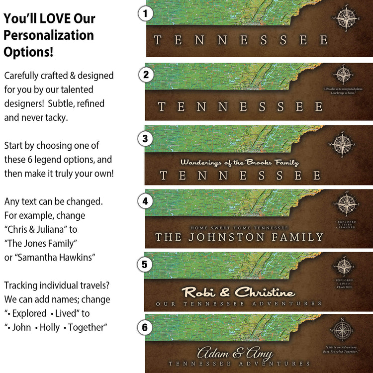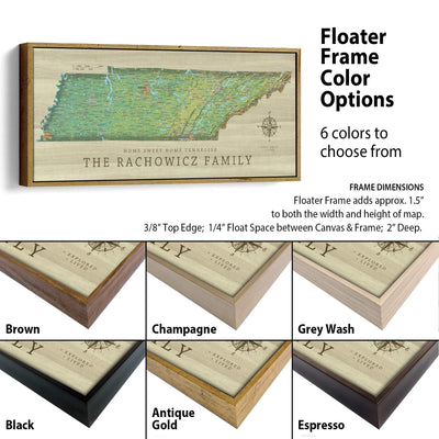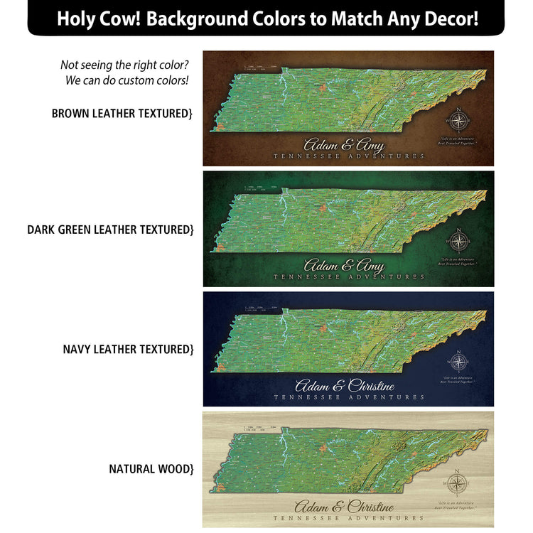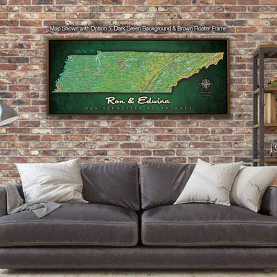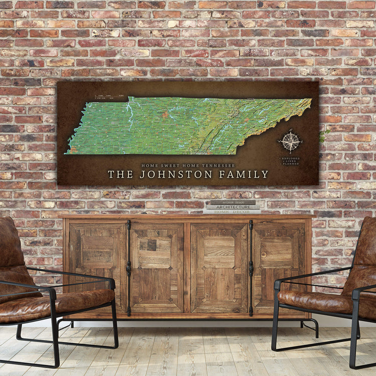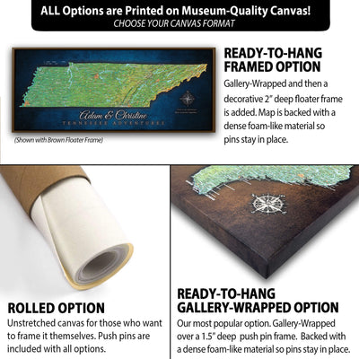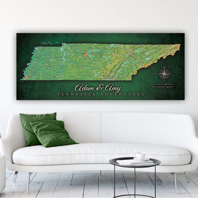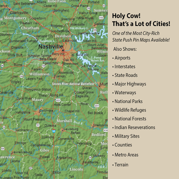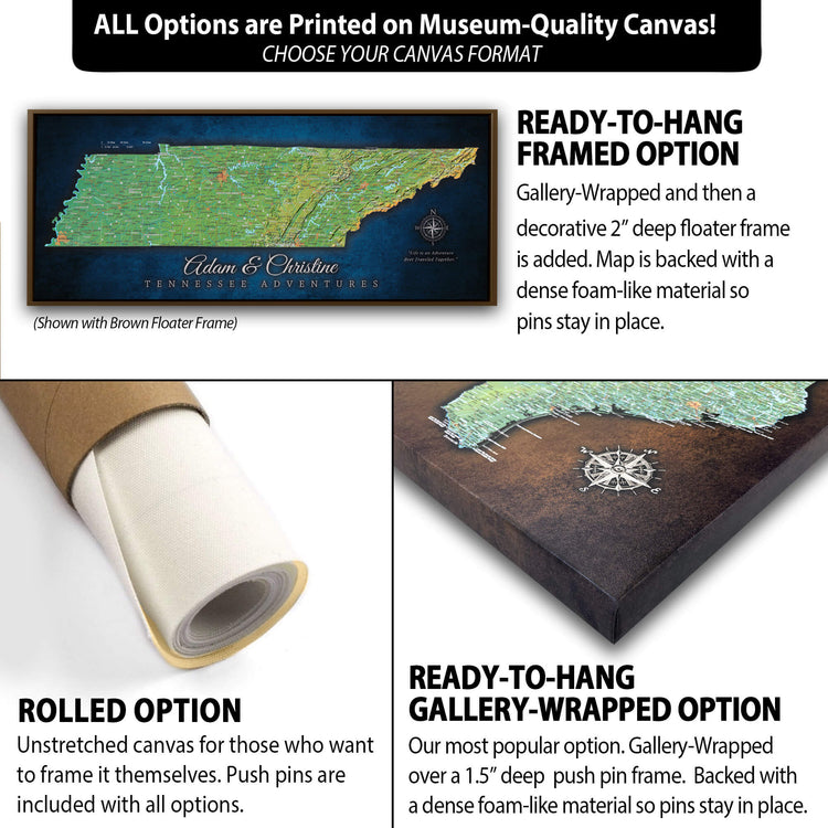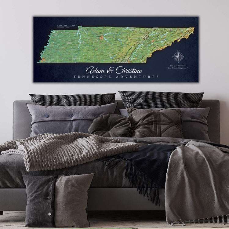 Our Tennessee Push Pin Map with Terrain allows you to pin the places you have traveled or have lived in Tennessee. Beautiful as wall art showcasing your state pride but fun to start conversations about your favorite places traveled. Superb clarity with abundant city and towns. Makes a great wedding, anniversary, new home or graduation gift to commemorate one's roots, and is customizable for a truly personal gift.  Available in 4 background color options to coordinate with most decors.  Highly detailed, map features roads, highways, interstates, rivers, lakes along with National Parks & Forests, and military sites. Tennessee State map is gallery-wrapped with a premium canvas; foam-like material under canvas ensures pins stay in place. Easy and ready-to-hang; no additional framing necessary.