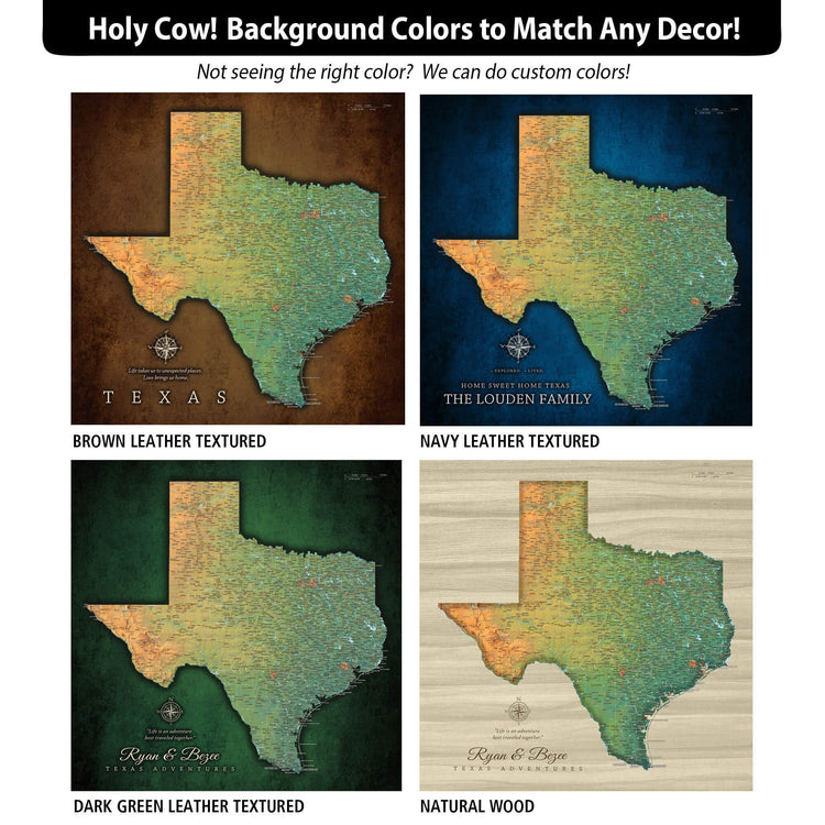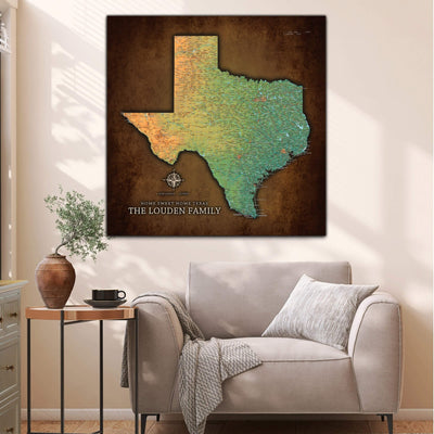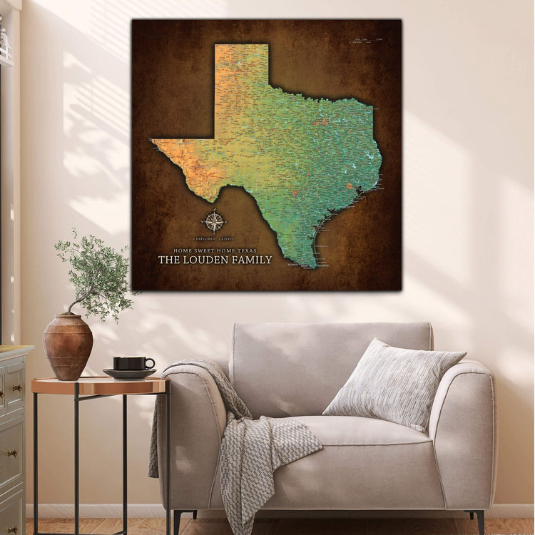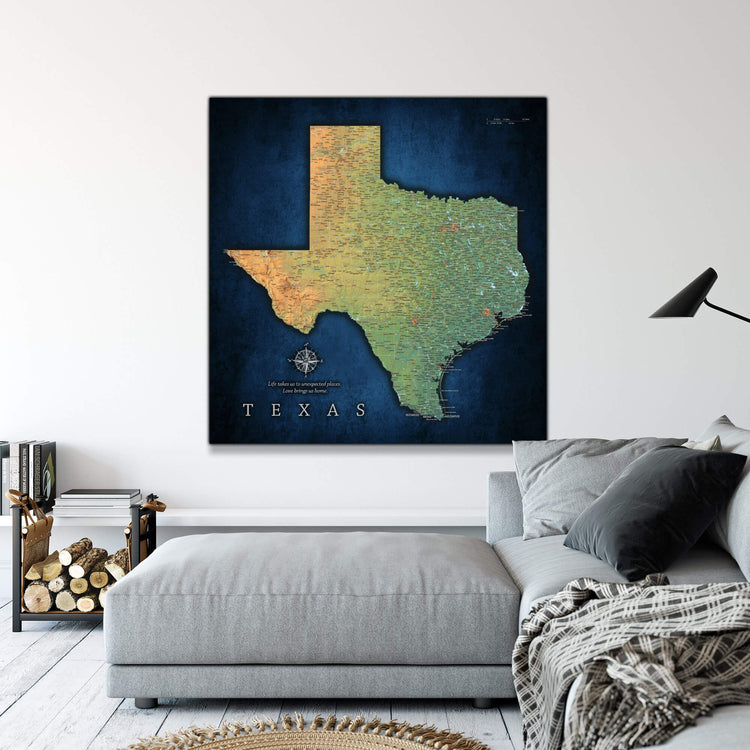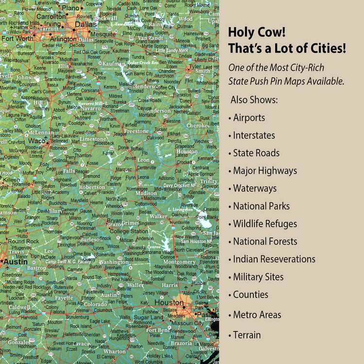 Our Texas Push Pin Map with Terrain allows you to pin the places you have traveled and/or lived in Texas. Beautiful as wall art showcasing your state pride but fun to start conversations about your favorite places traveled or lived. Superb clarity with abundant city and towns. Makes a great wedding, anniversary, new home or graduation gift to commemorate one's roots, and is customizable for a truly personal gift. Highly detailed, map features roads, highways, interstates, rivers, lakes along with National Parks & Forests, and military sites. Texas State map is gallery-wrapped with a premium, museum-grade canvas. Foamlike material under canvas ensures pins stay in place. Easy, lightweight and ready-to-hang; no additional framing necessary. Rolled option is available for those who want to frame map themselves (DIY). Handmade in the USA, in the great state of Indiana!