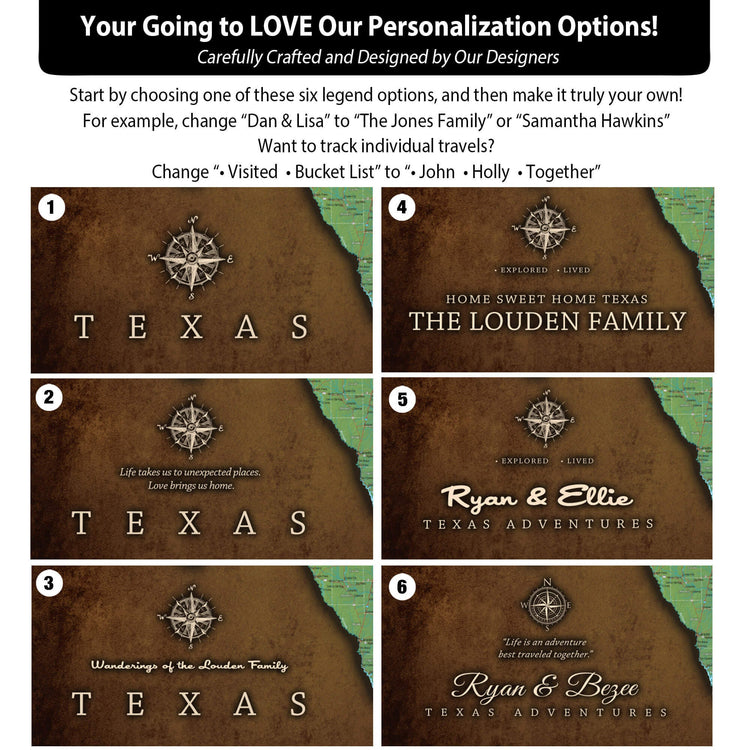 The map can be fully customized. Choose from the quote & legend options shown. Type your custom text in the “Personalize Your Canvas” field.