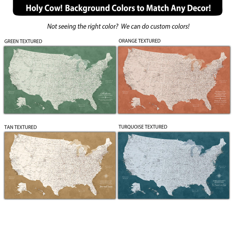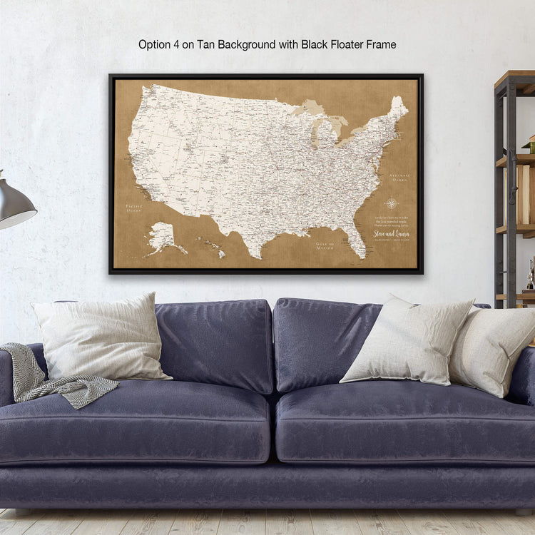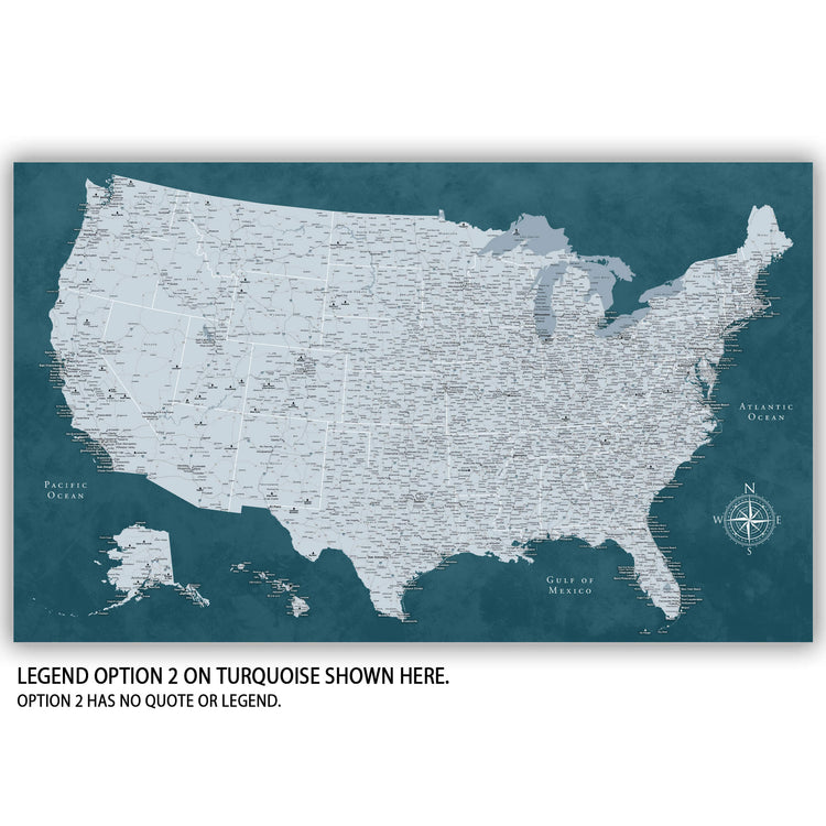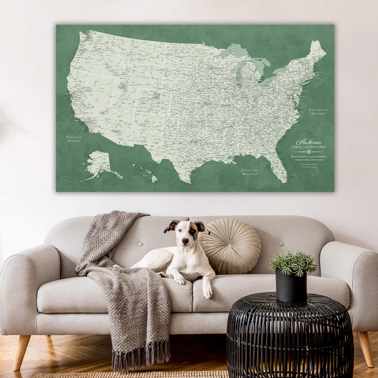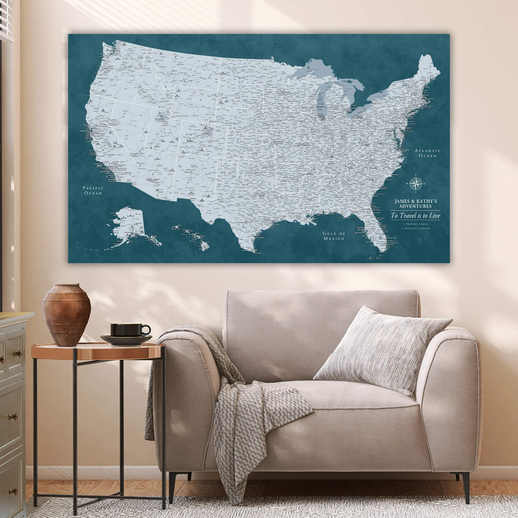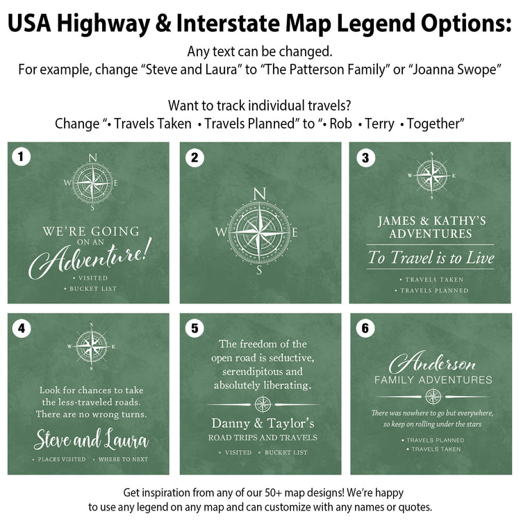 Track your travels on this pinnable United States map that features interstates and major highways. US with pins is perfect for reminiscing about past adventures and planning new ones. Map can be customized with names and quotes to create a truly one-of-a-kind keepsake. Legend options can be personalized to track individual or family travels. Swipe through additional photos to see personalization options & close-up details.