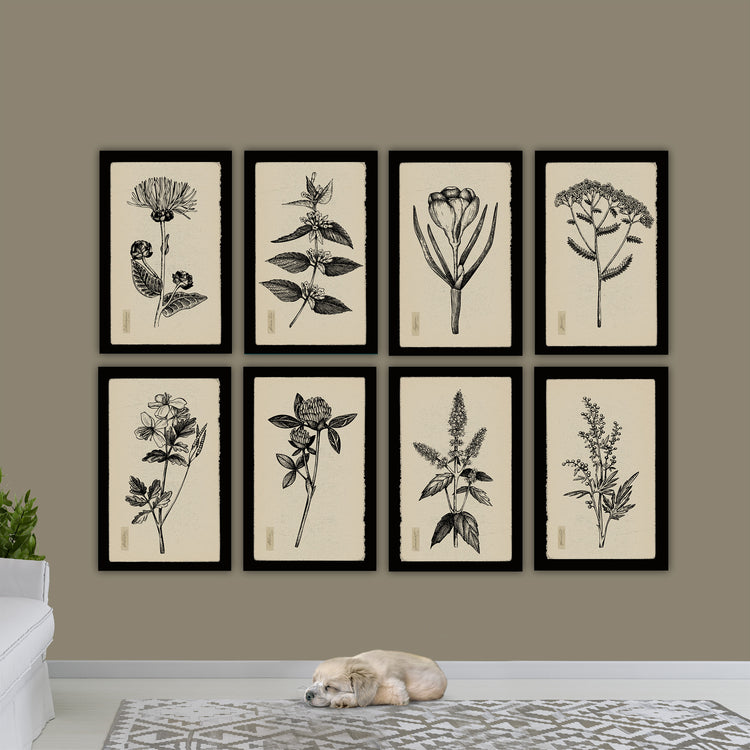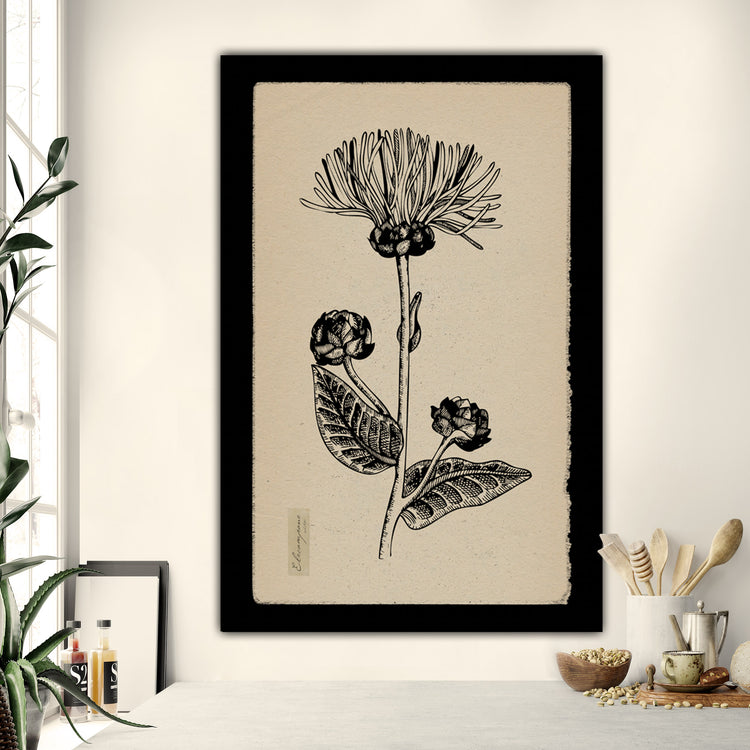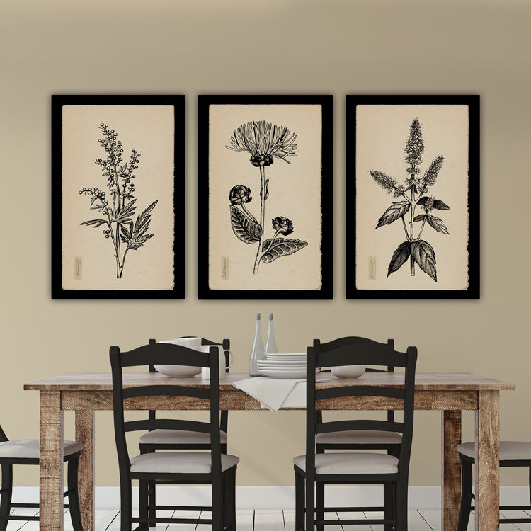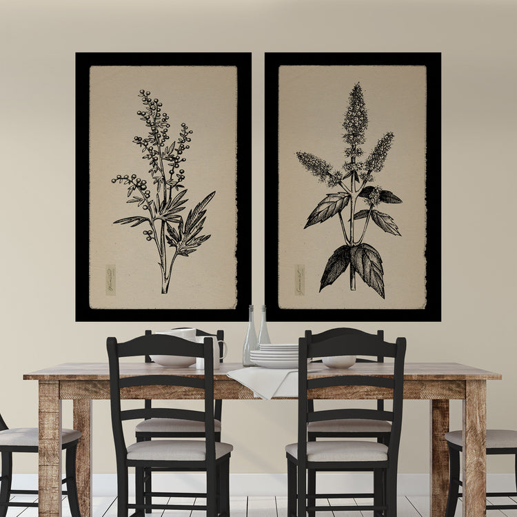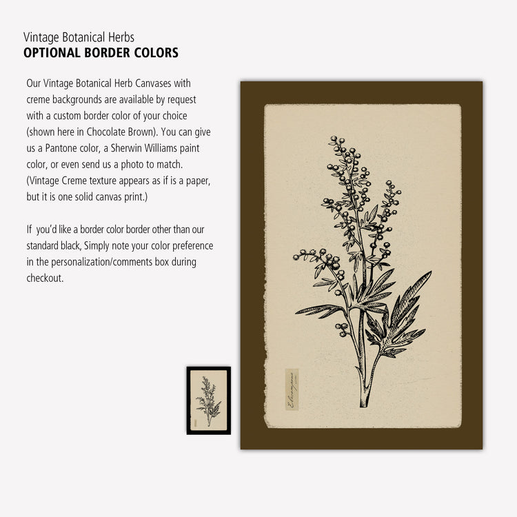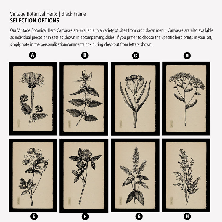 Botanical Herbs on Canvas with Black Edges and Creme Backgrounds are the perfect Nature art for your kitchen or dining walls. Vintage look pen and ink Herb illustrations come in a multitude of sizes up to 40x60 inches. Framed black border can be changed and customized with any color you desire. Choose from Elecampane, Saffron, Yarrow, Celandine, Clover, Lemon Tree, Spearmint, and/or Wormwood illustrations. Available in single panels or in sets. Complements your tan or beige toned walls well.