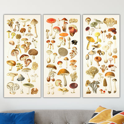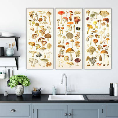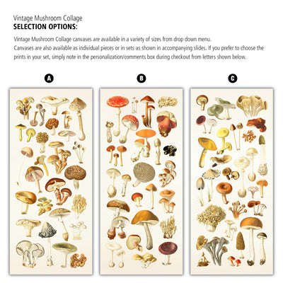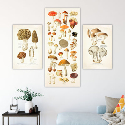 3 Mushroom Collages with vintage images from Atlas of Edible and Poisonous Mushrooms, published in 1891. Victorian botanical illustrations printed on archival canvas. Choose an individual print or a set of 2 or 3. Prints are available in sizes from 10 to 48 inches wide. As seen in the photos, these collages coordinate beautifully with other prints in my Botanicals section - check out the whole collection!