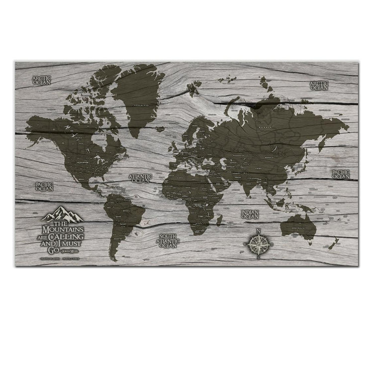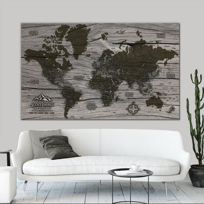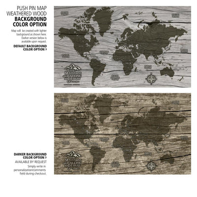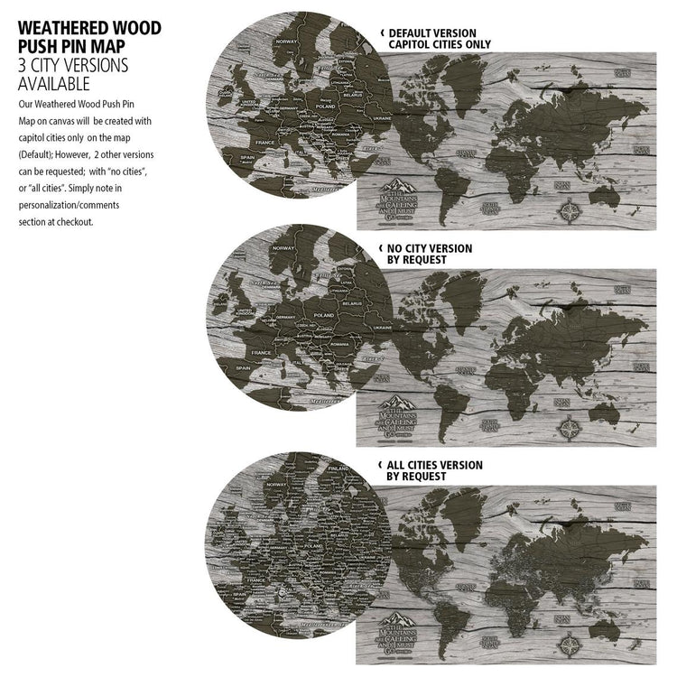 Our Push Pin World Weathered Wood Look Map is highlighted by a rustic wood-grain background with a vibrant terrain printed on premium canvas. Cities can added or removed; default is capitol cities only. Map can be personalized with abundant options. Excellent clarity. Ready to hang - no additional framing necessary. Superior foam-like backing under our special, blended canvas ensures your push pins will stay intact.