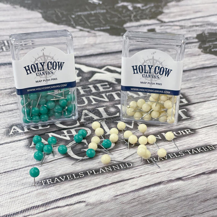 Your map comes with 100 push pins; 50 each of two colors. One color for Travels Planned and another for Travels Taken.