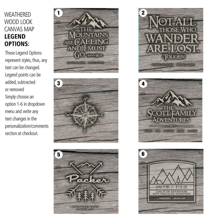 The map can be fully customized. Choose from the quote & legend options shown. Type your custom text in the “Personalize Your Canvas’ field.