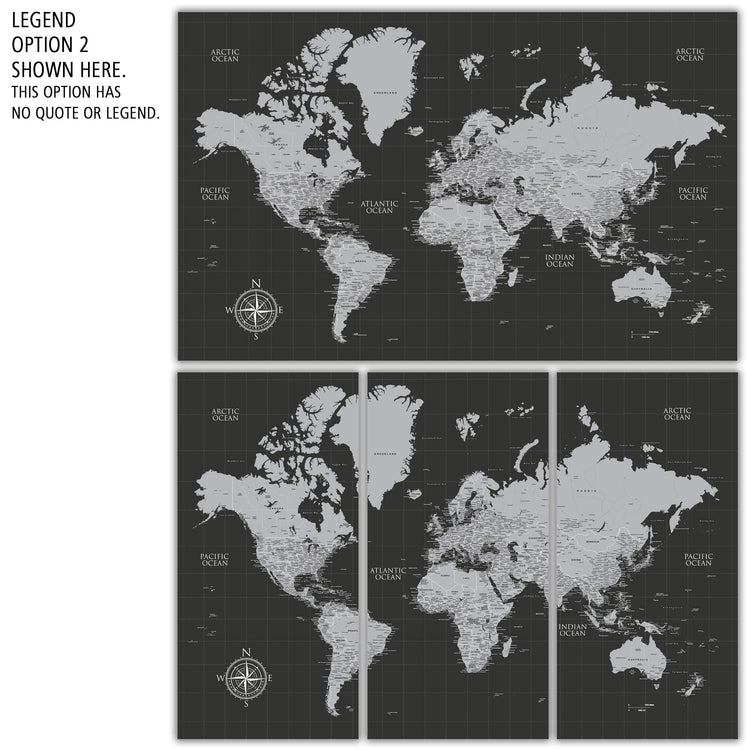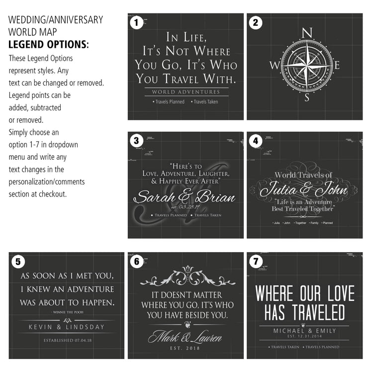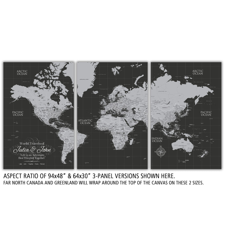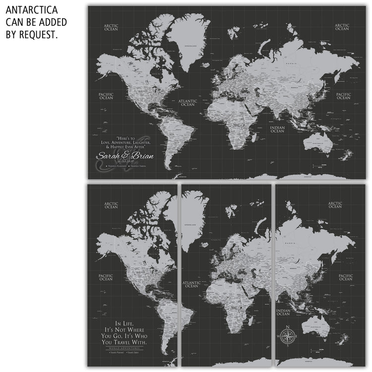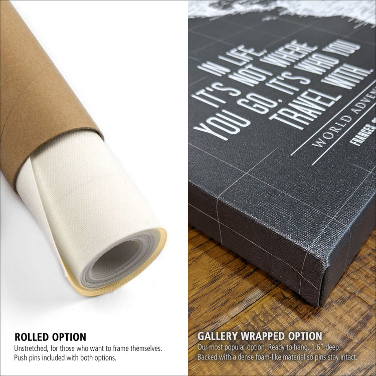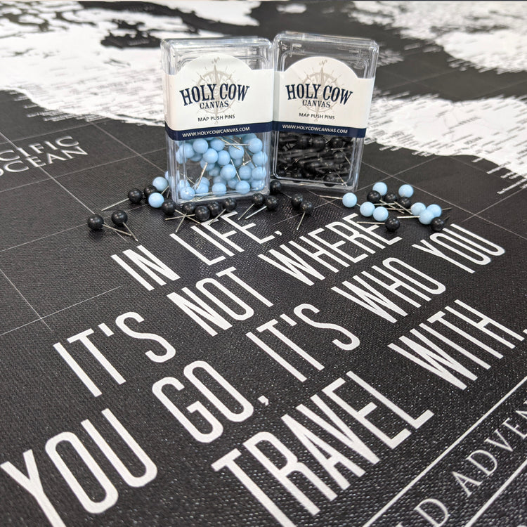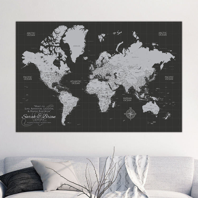 Love is in the Air with our Wedding-Anniversary-Valentine's Push Pin Travel Map. Features a solid charcoal grey backing on a Single Panel to coordinate with most decors. Great Wedding or Anniversary Gift, Choose from 7 quote & legend style options. Excellent clarity with highly detailed cities and countries. Map is READY to HANG - No additional framing necessary. Superior foam-like backing under our special, blended canvas ensures your pins will stick and stay intact.