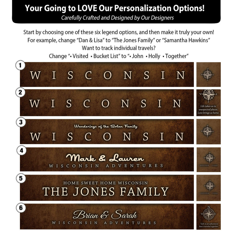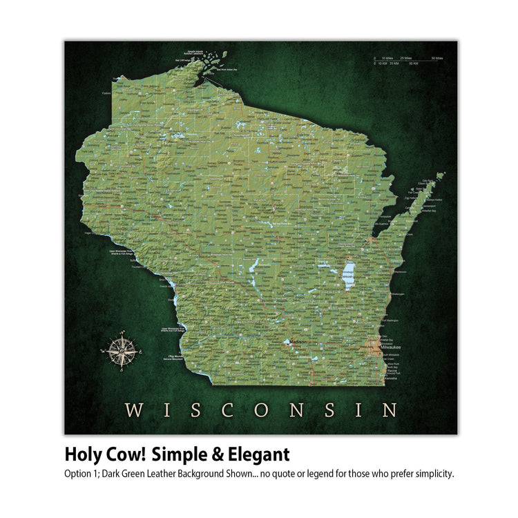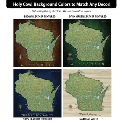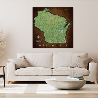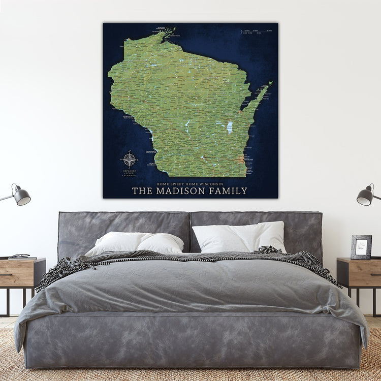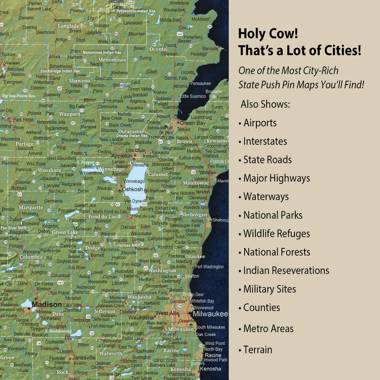 Our Wisconsin State Push Pin Map with Terrain allows you to pin the places you have traveled or have lived in Wisconsin. Beautiful as wall art showcasing your state pride but fun to start conversations about your favorite places traveled. Superb clarity with more city and towns. Holy Cow! "NO CHARGE" for personalization. Makes a great wedding, anniversary, new home or graduation gift to commemorate one's roots for a truly custom gift. Highly detailed, map features roads, highways, interstates, rivers, lakes along with National Parks & Forests, and military sites. Our Wisconsin Map is gallery-wrapped with a "premium" canvas--better than box-store quality. Foam-like material under canvas ensures pins stay in place. Easy, lightweight and ready-to-hang; no additional framing necessary; Rolled option is available for those who want to frame map themselves (DIY). Made in the USA!