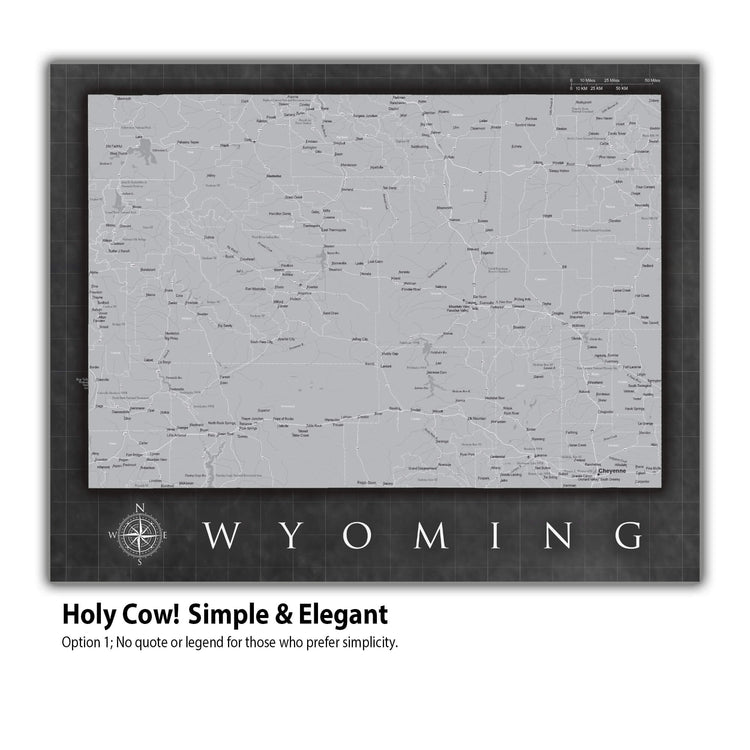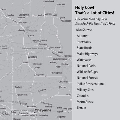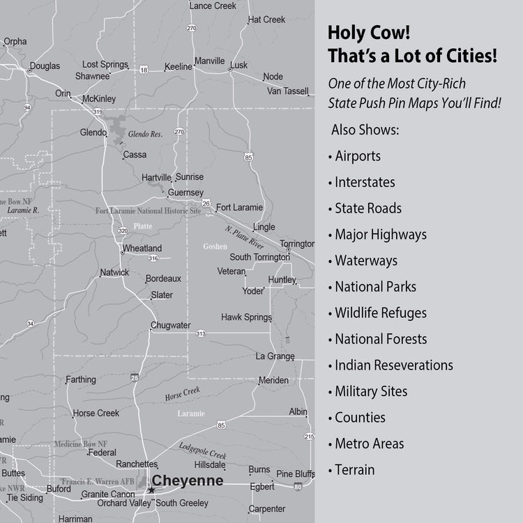 Grey Wyoming State Push Pin Map allows you to pin the places you have traveled or have lived in Wyoming. Or Simply use as beautiful as wall art showcasing your state pride. Great conversation starter. Superb clarity with abundant city and towns. Holy Cow! "NO CHARGE" for personalization. Makes a great wedding, anniversary, new home or graduation gift to commemorate one's roots for a truly custom gift. Highly detailed map features roads, highways, interstates, rivers, lakes along with National Parks & Forests, and military sites. Our Wyoming Map is gallery-wrapped with a "premium" canvas--better than your box-store quality. Foam-like material under canvas ensures pins stay in place. Lightweight, Easy & ready-to-hang; no additional framing necessary; however, a Rolled option is available for those who want to frame map themselves (DIY). Made in the USA!