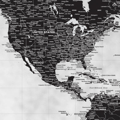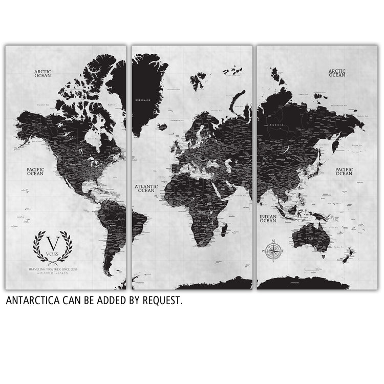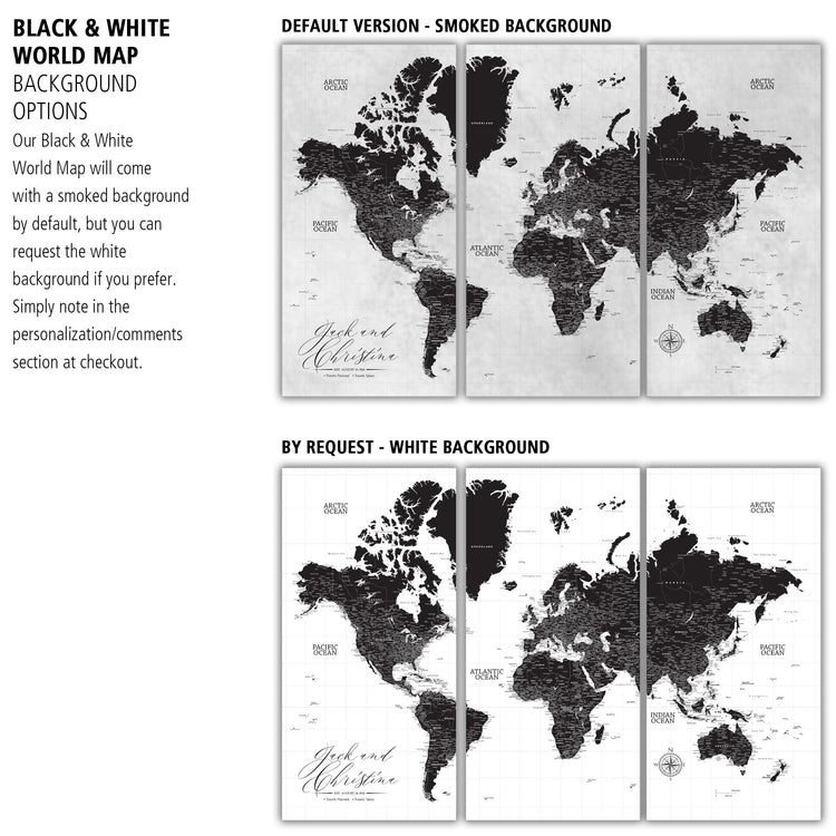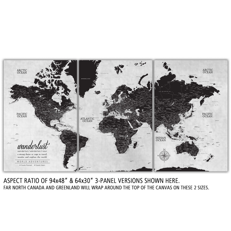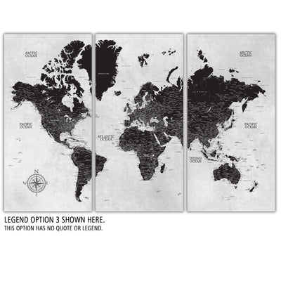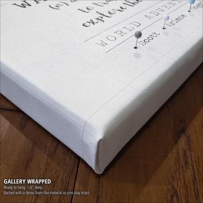Our Extra Large Black & White World Push Pin Map serves as a great art piece and map to plot your travels. Huge wall art is available in sizes up to 94 Inches wide. From Traditional to Modern Farmhouse to Contemporary, this map coordinates with most decor styles. Map features a white or smoked white background with options to customize the quote and legend. Makes a great wedding, new home or travel gift. Highly detailed cities and excellent clarity. Ready to hang - no additional framing necessary. Superior foam-like backing under our special, blended canvas ensures your push pins will stay intact.