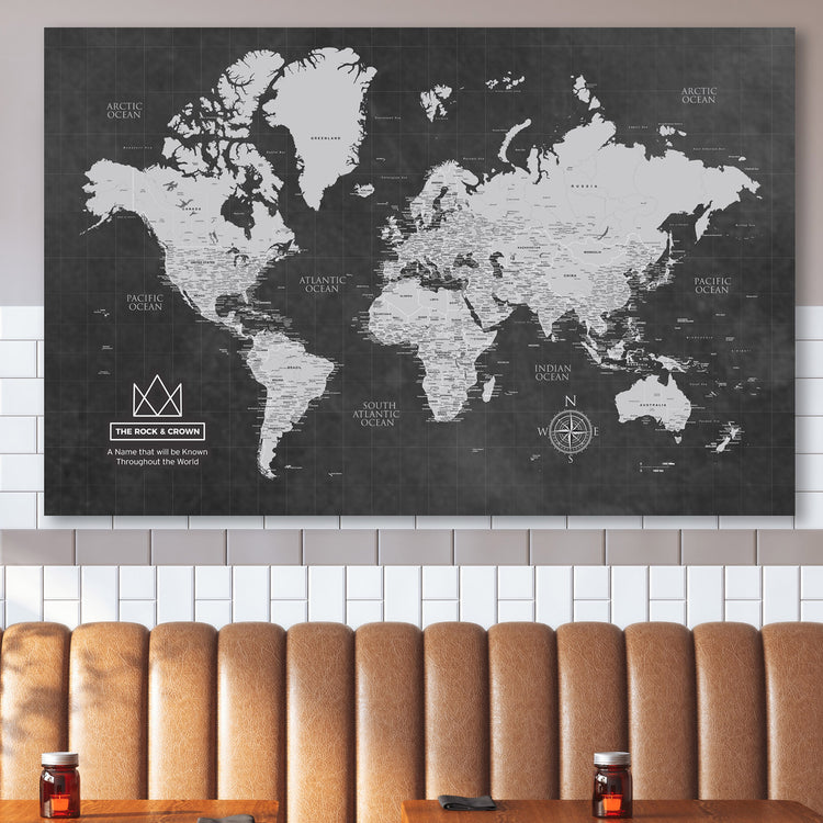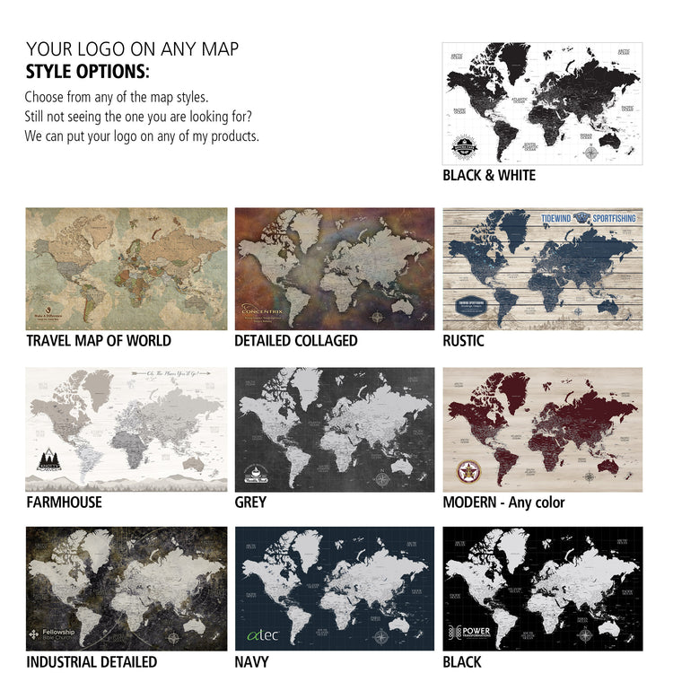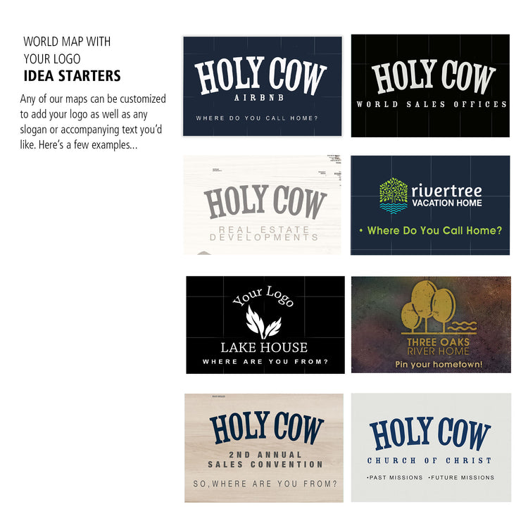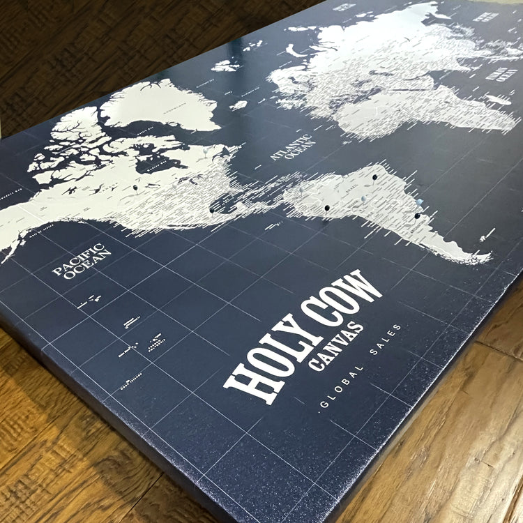 Holy Cow, it's the perfect map decor your Airbnb, office or lobby is needing. Our premium World Push Pin Map with your logo or custom text is a great way to personalize your walls and welcome guests. Choose any of our map styles to coordinate with your logo colors. Map can be used for tracking sales, office or real estate locations, church missions, or your BNB guests will enjoy pinning their stay and seeing where others guests call home. A custom line of text can be added (see attached samples). EASY to & READY to HANG - no additional framing necessary. Map is printed on Canvas and foam-like backing underneath ensures the push pins stay intact.