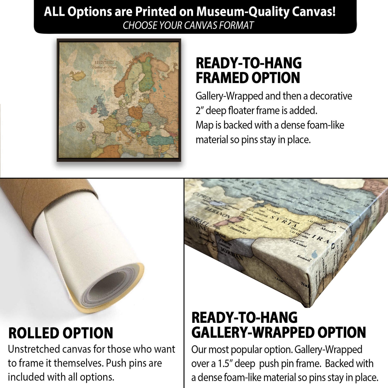 Map is available Ready to hang - no additional framing necessary, gallery-wrapped around a push pin frame. Superior foam-like backing under our special, blended canvas ensures your pins will stay intact. Rolled option includes no frame or backing, simply the rolled canvas for those who want to finish it themselves.
