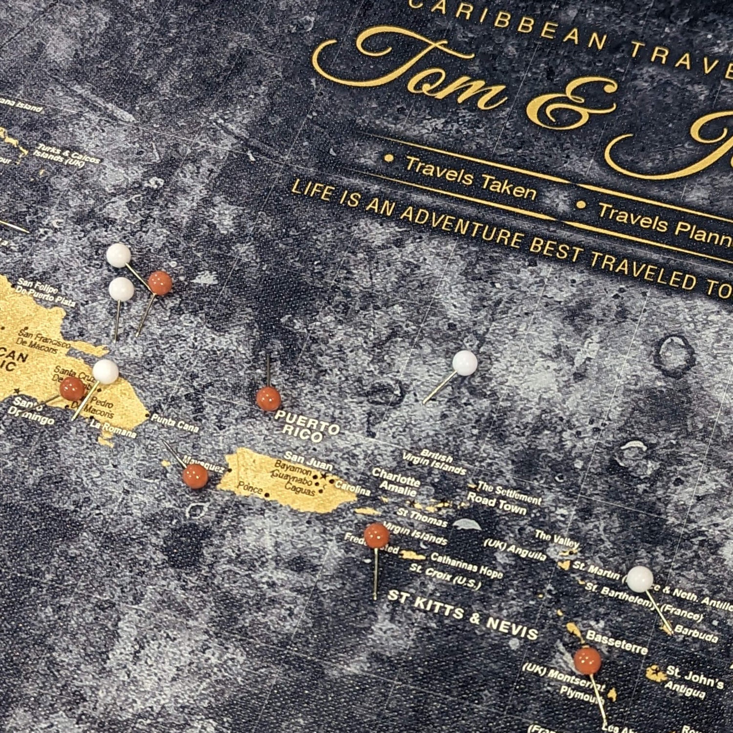 Our Gold & Navy Textured Caribbean Map brings classic nautical style with a dramatic flair to any room. This pinboard map is perfect for tracking your travels and planning where you're heading next. Map features superb clarity with excellent city and country details. Swipe through additional photos to see personalization options & close-up details.