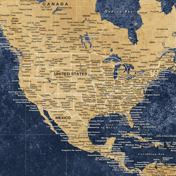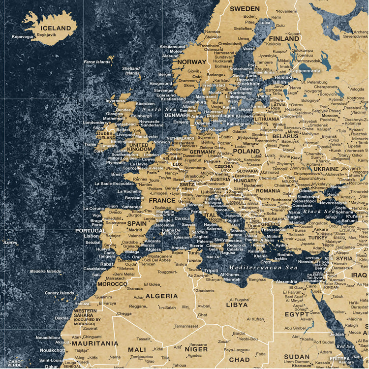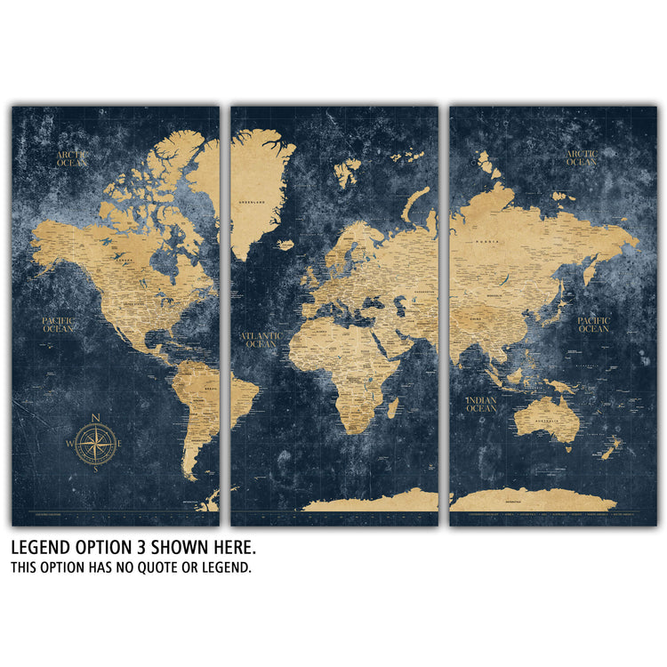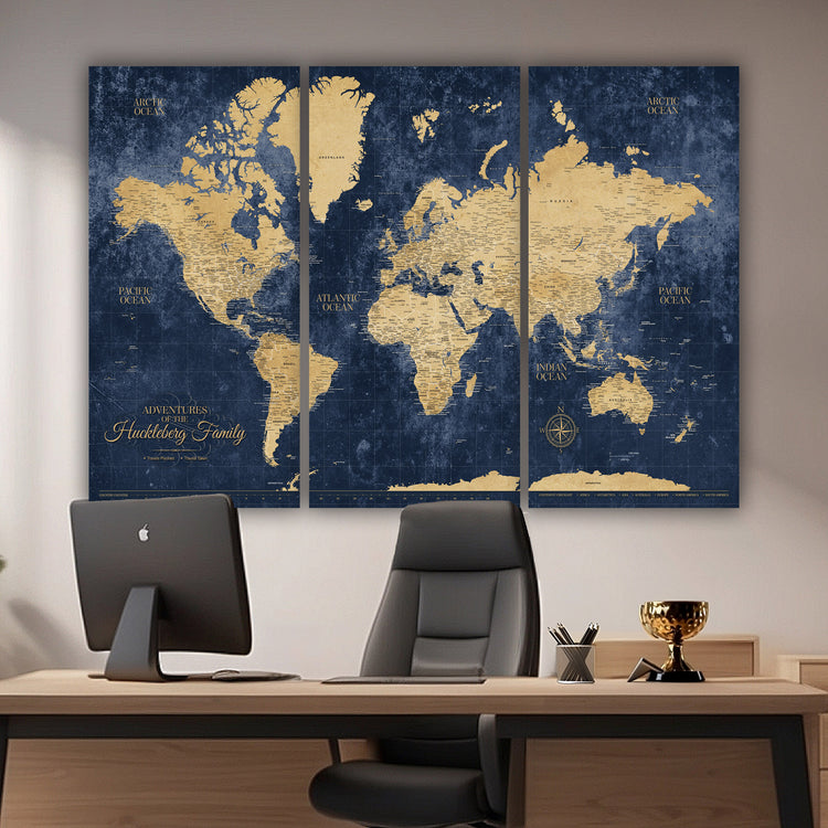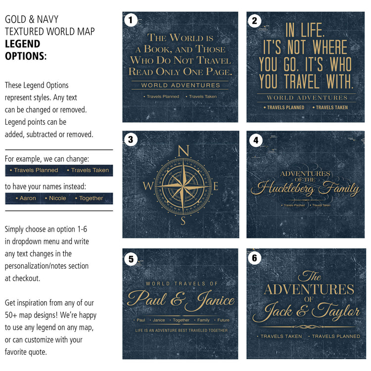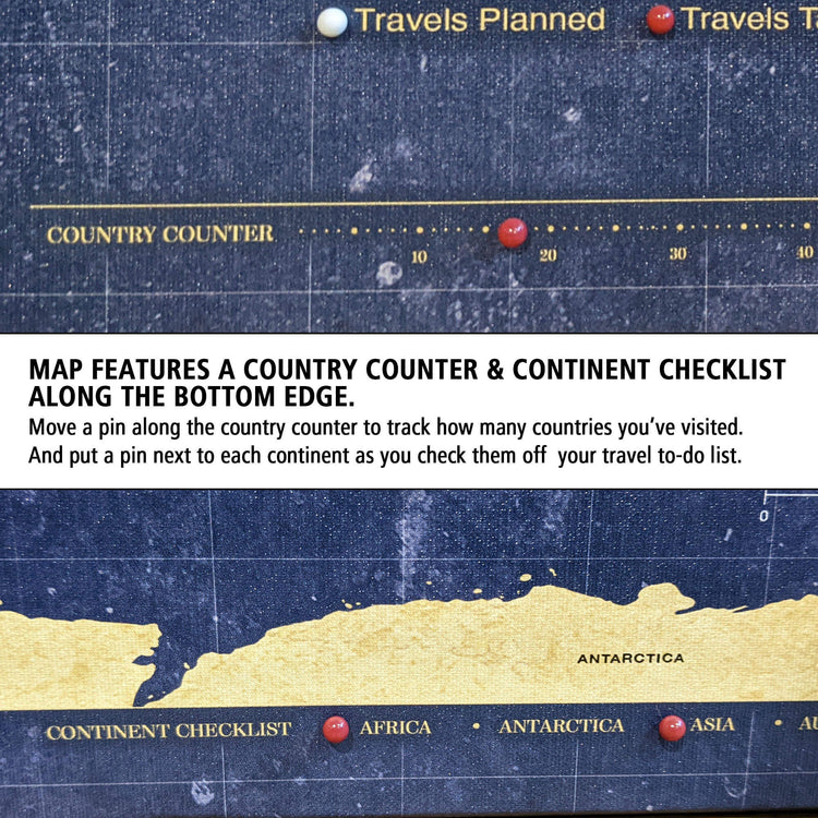 Our Gold & Navy Textured World Map brings classic nautical style with a dramatic flair to any room. Large format up to 94 inches wide is ideal to pin and display your world adventures above your couch. Perfect for tracking your travels and planning where you're heading next. Plus, keep count of how many countries and continents you've visited with the trackers along the bottom edge.