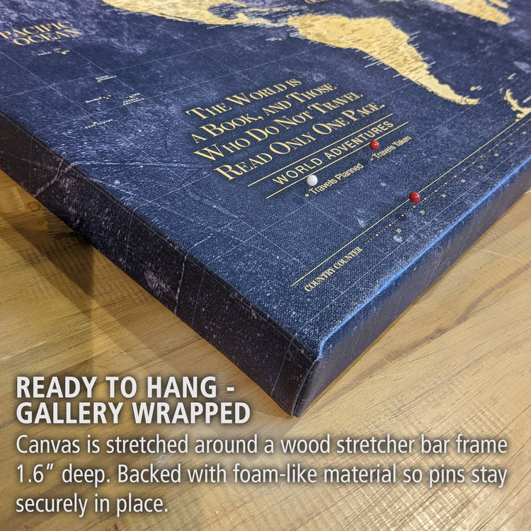 Superb clarity with excellent city and country details. Gallery-Wrapped with a Premium Canvas backed with foam-like material ensures pins stay in place. Canvas hides pinholes if pins are removed and/or changed. Swipe through additional photos to see personalization options & close-up details. EASY to & READY to HANG - no additional framing necessary.