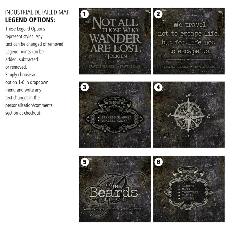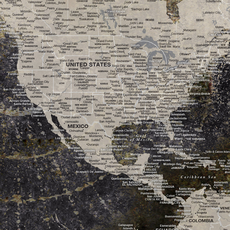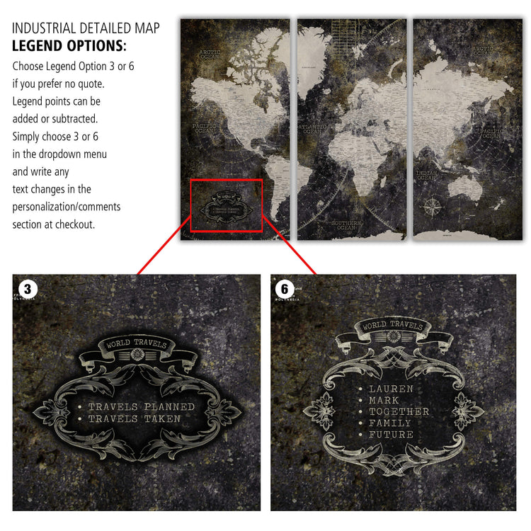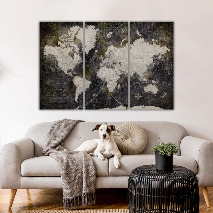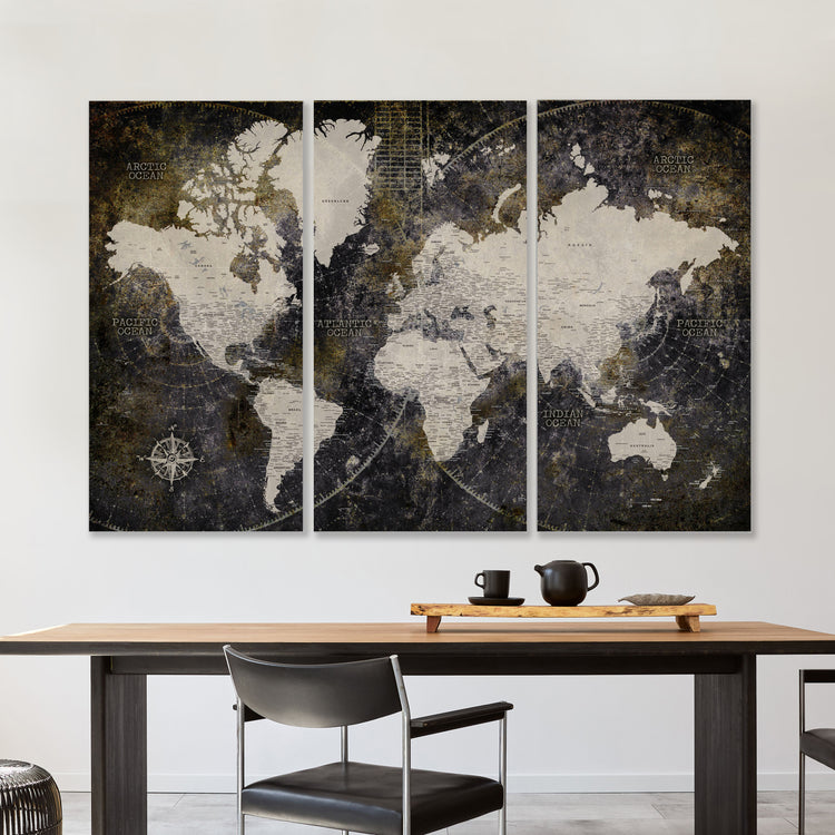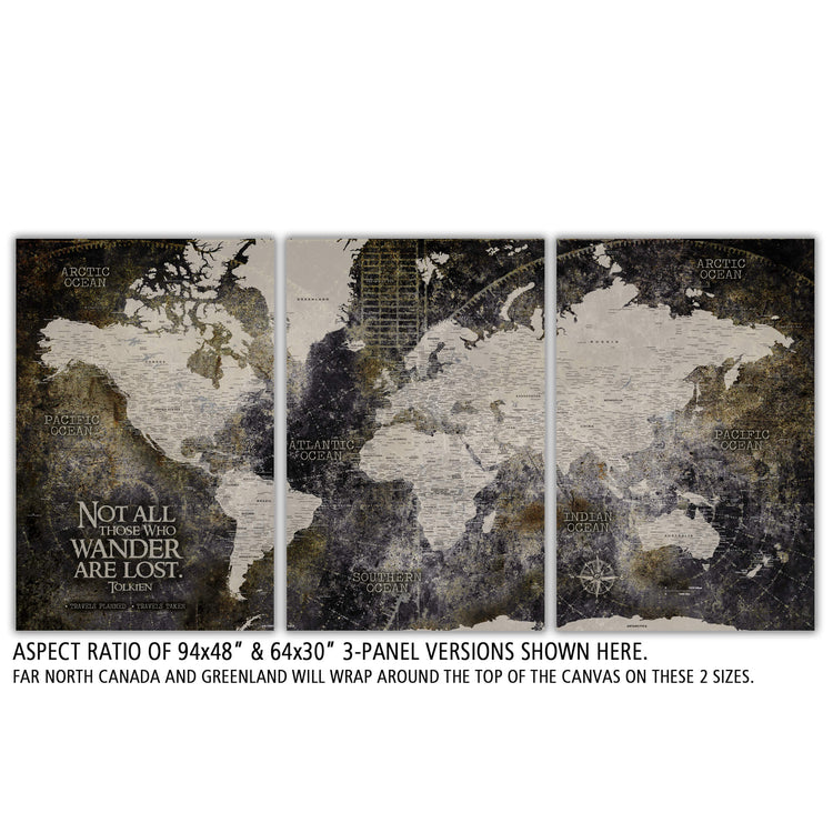 Industrial Detailed Push Pin World Travel Map in a 3 panel design. Large format up to 94 inches wide is ideal to pin and display your world adventures above your couch. Worn, industrial map features superb clarity with highly detailed cities. Gallery Wrapped Canvas backed with foam-like material ensures pins stay intact. Special blended canvas hides pinholes if pins are removed and/or changed. Ready to hang. Great gift for the world travelers.