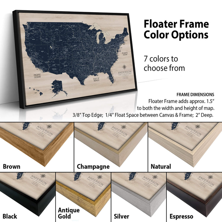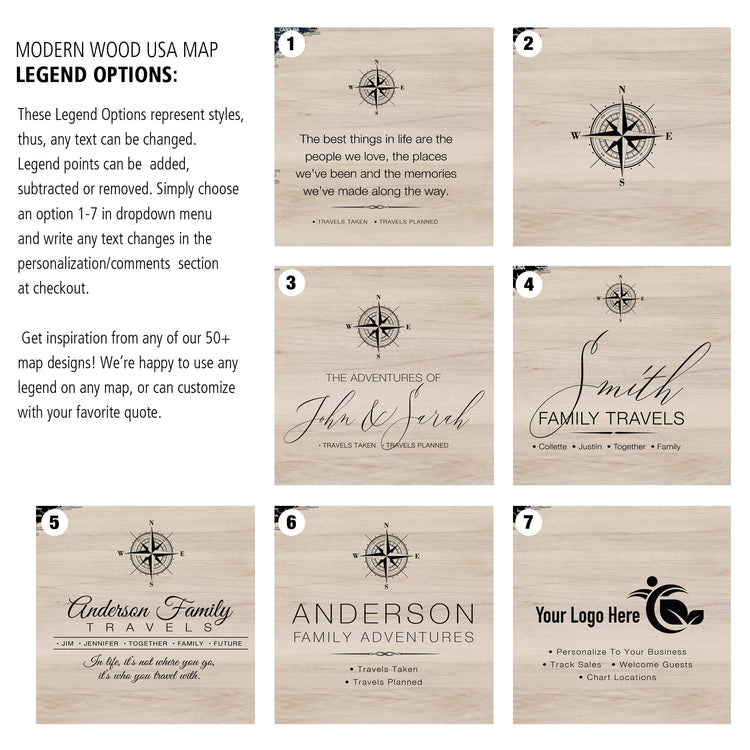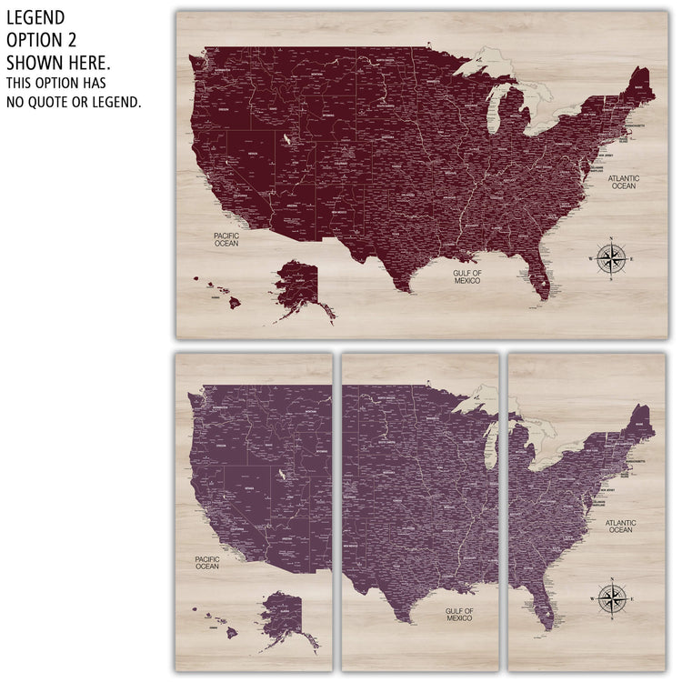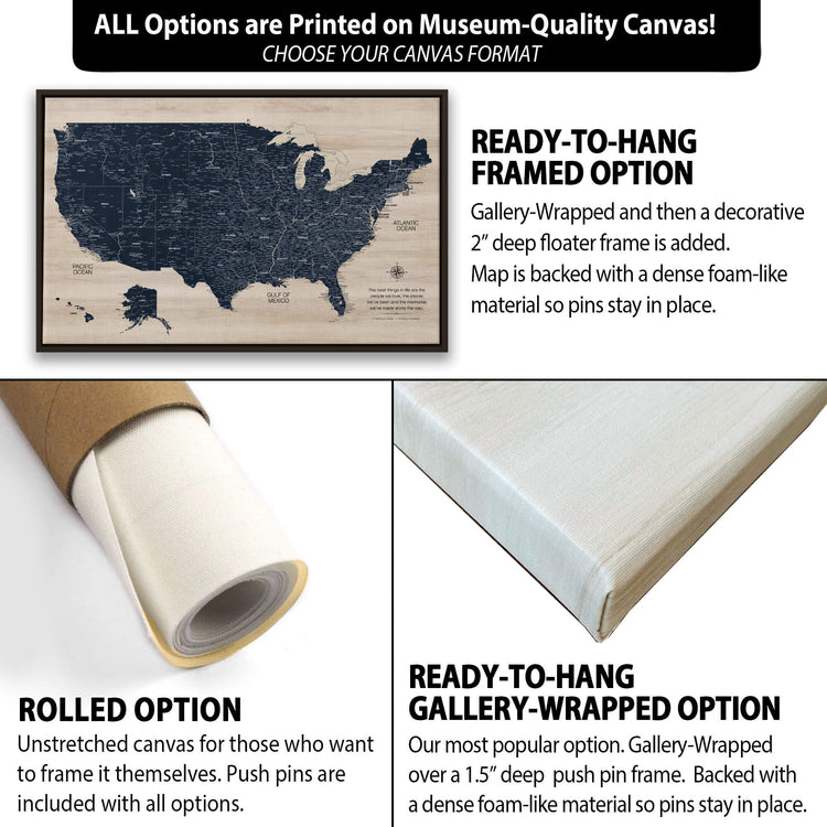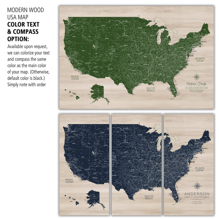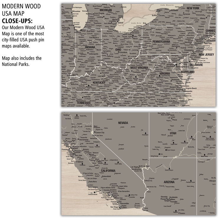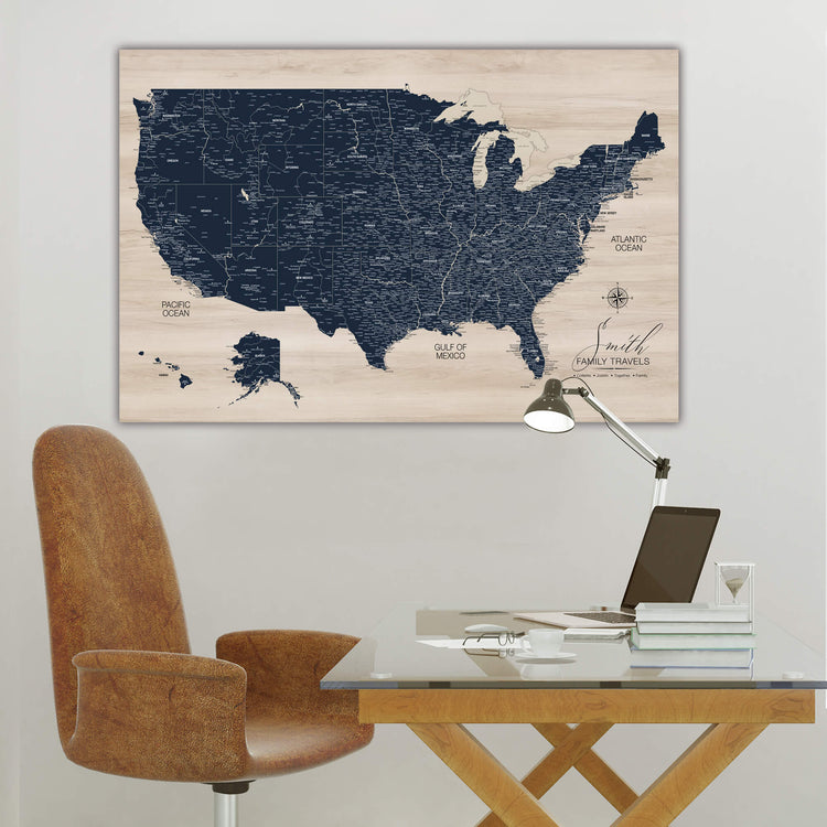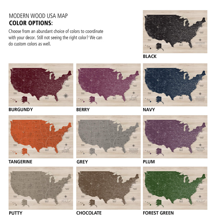 Modern Wood USA Push Pin Map features a birch wood look printed on premium canvas for a modern, upscale look. Choose from ten trending colors or we can customize your map to a color of your choice. One of the most city-rich world maps available! Map can be personalized with abundant quote and legend text options for a one-of-a-kind travel or wedding gift or perfect for an executive office. Excellent clarity and lightweight. EASY to & READY to HANG - no additional framing is necessary. Foam-like backing ensures pins stay intact.