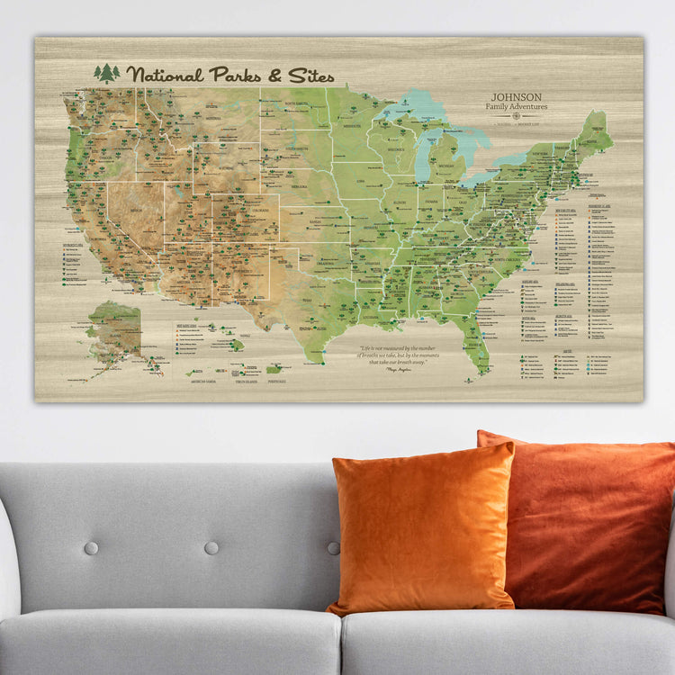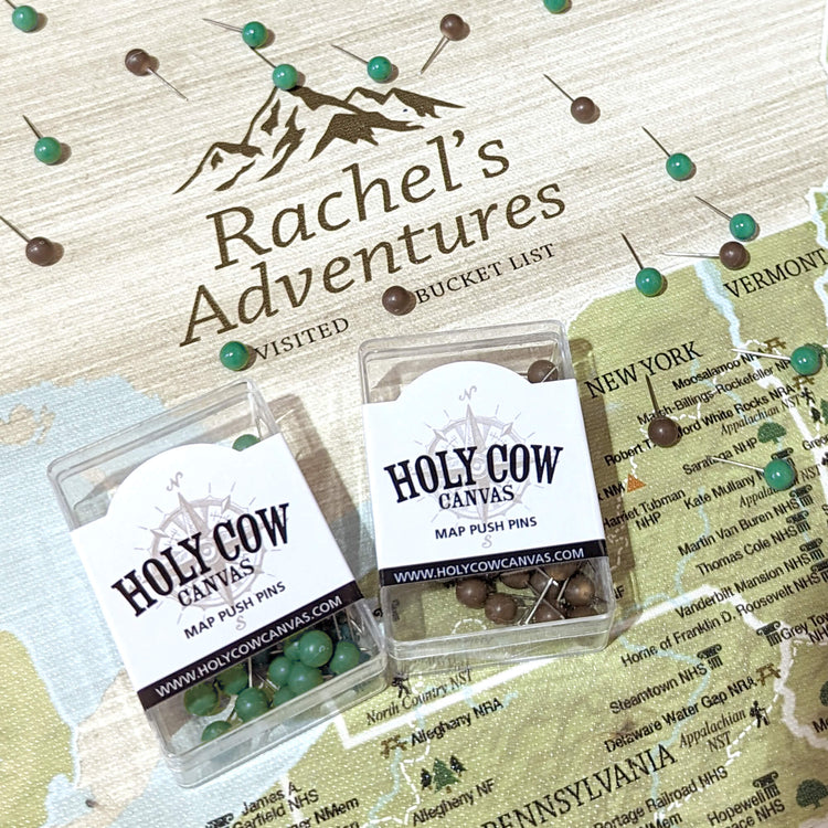 I use my map, the metal motorcycle, and colored, plastic pins to show my travels around the USA. My map is a focal point in our living space and I love the way folks are drawn to it and how it promotes conversations! I love my Holy Cow Map!!