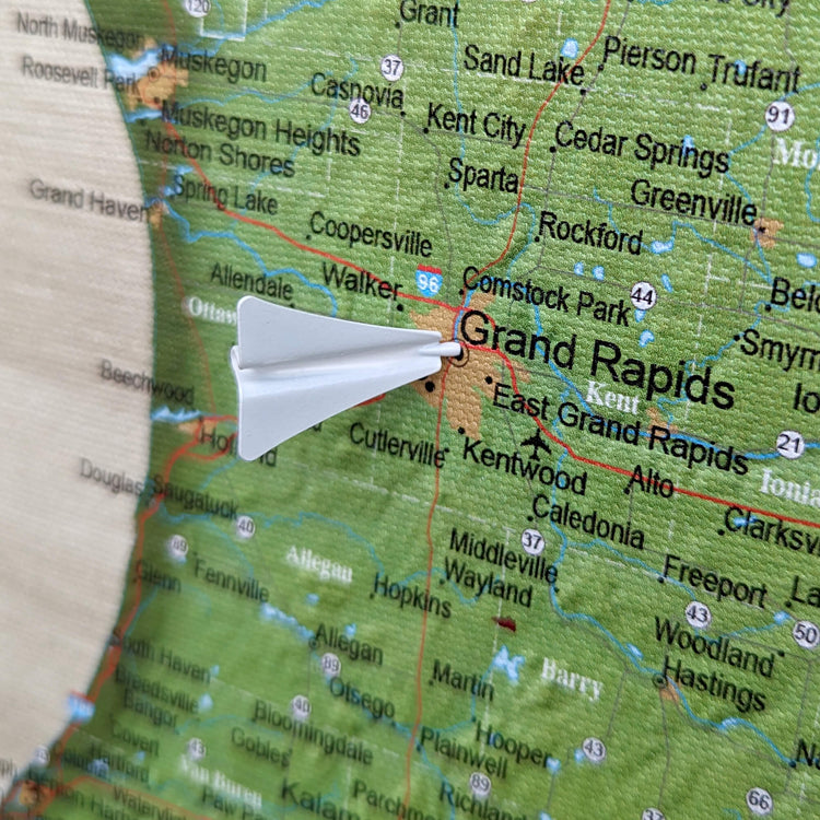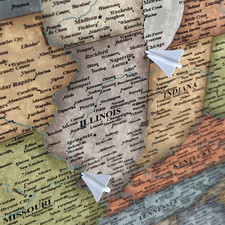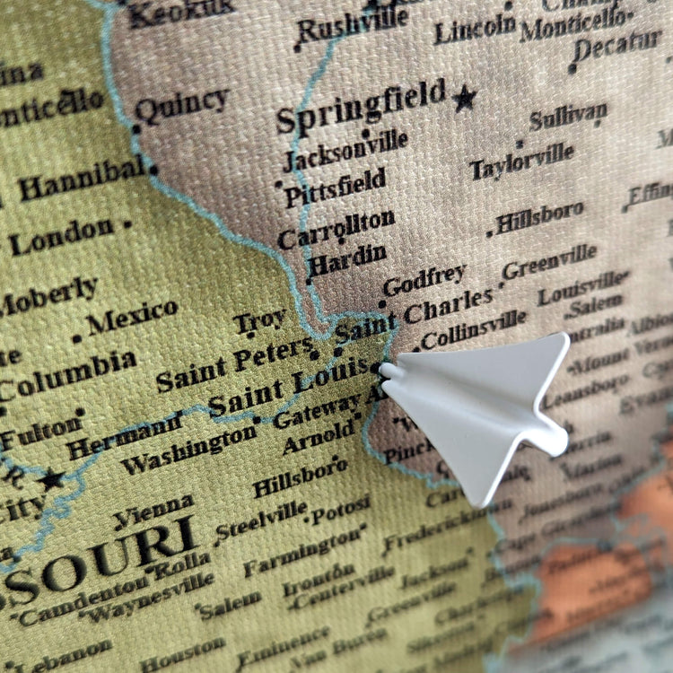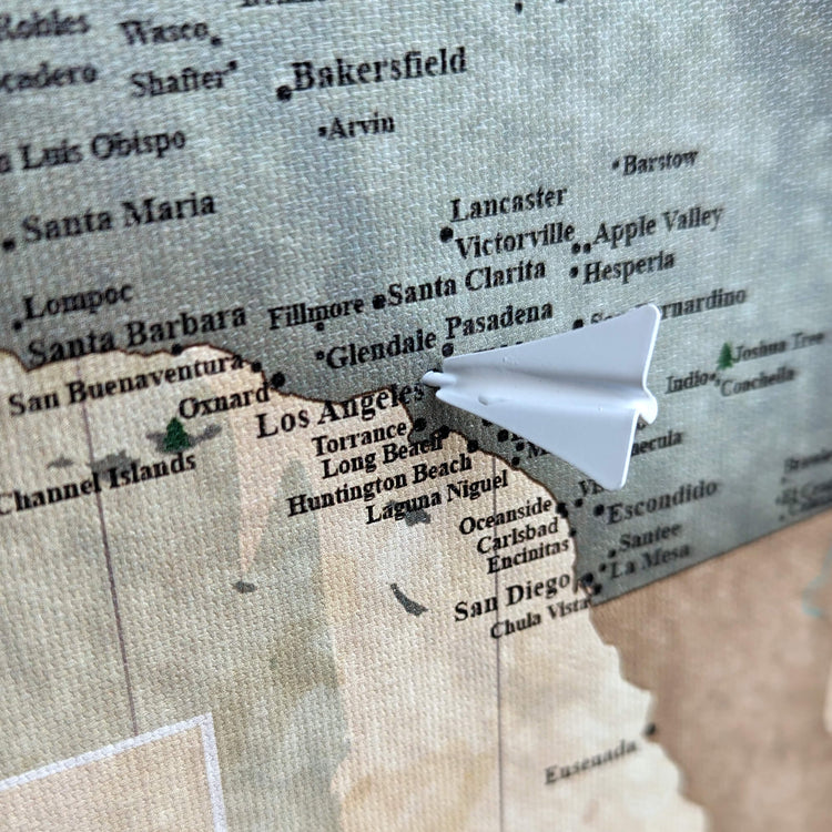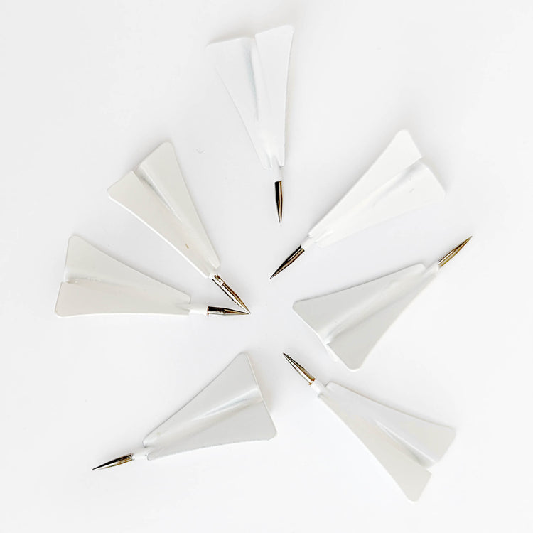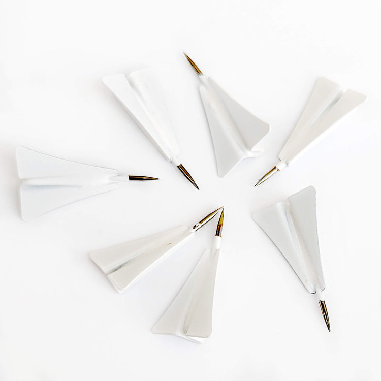 Shaped like perfectly folded paper airplanes, these pins are a fun addition to all of our Push Pin Maps. Use these 3D novelty map ins for marking flights of tracking travel destinations. Sold in sets of 6 or 12. Pins measure approximately 1.125" long and 5/8" wide (See listing photo for more detailed measurements). Arrives in a reusable container for easy storage of pins not in use.