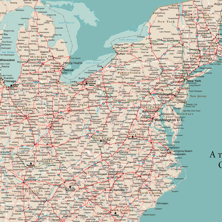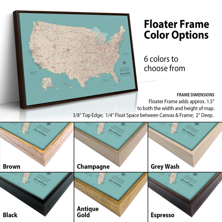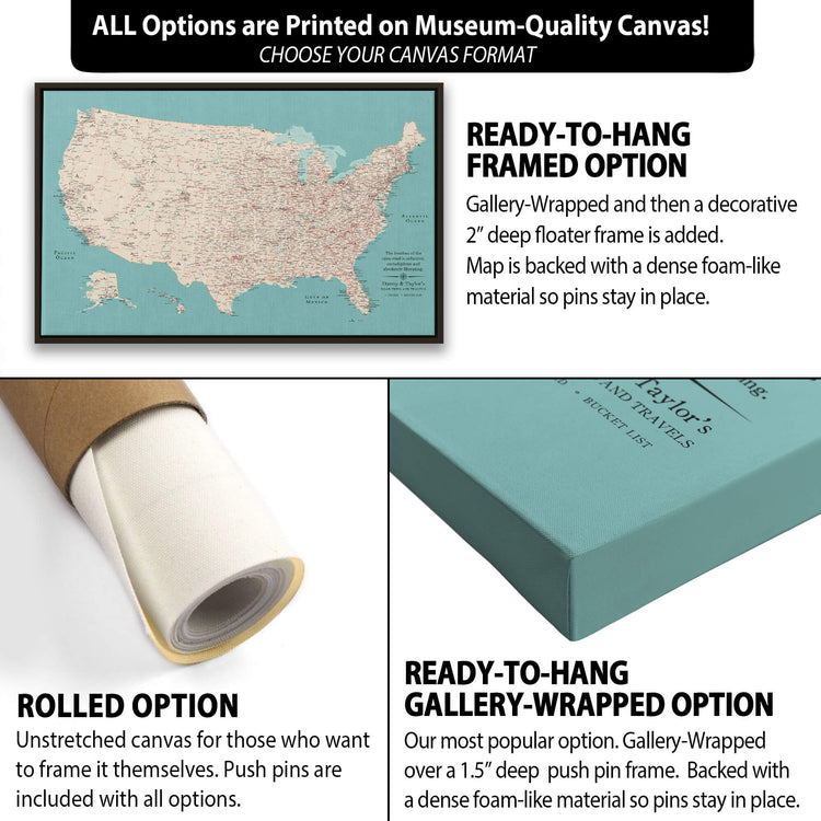 Superb clarity with excellent city details. Map is printed on a Premium Canvas. Gallery-Wrapped & Framed maps are backed with foam-like material ensures pins stay in place. Canvas hides pinholes if pins are removed and/or changed.