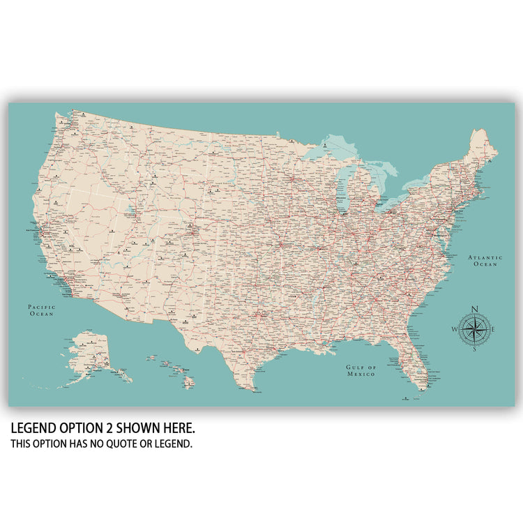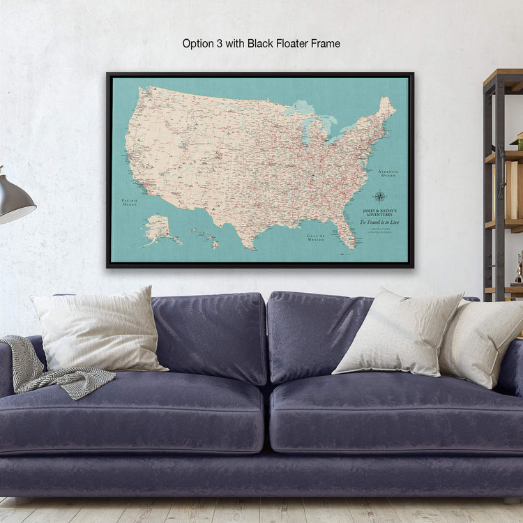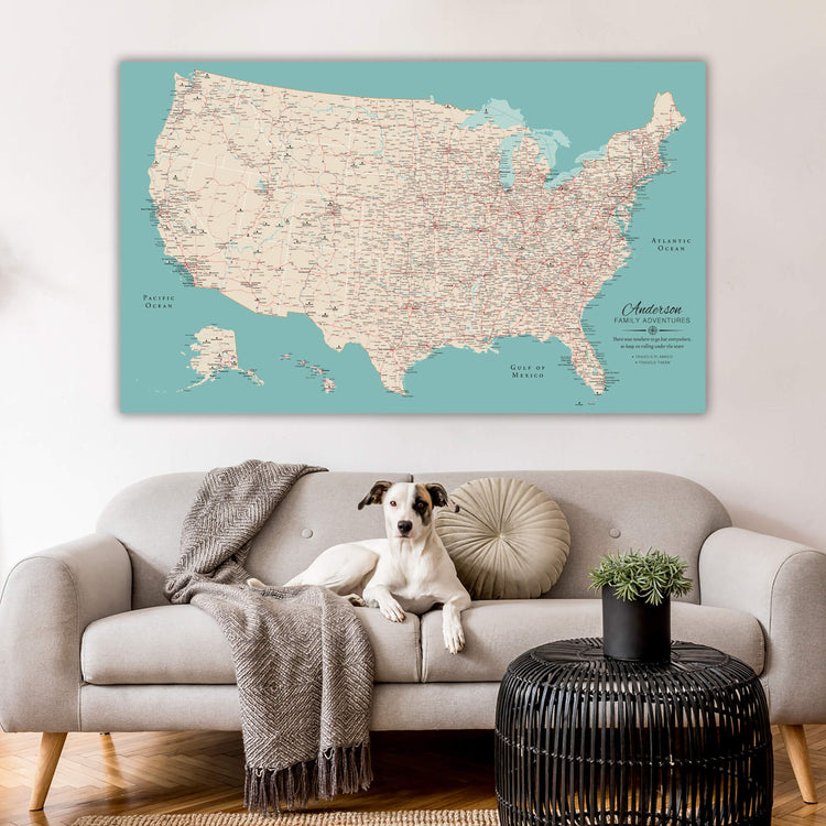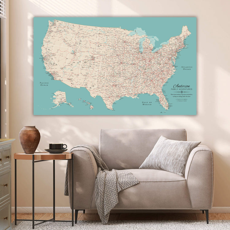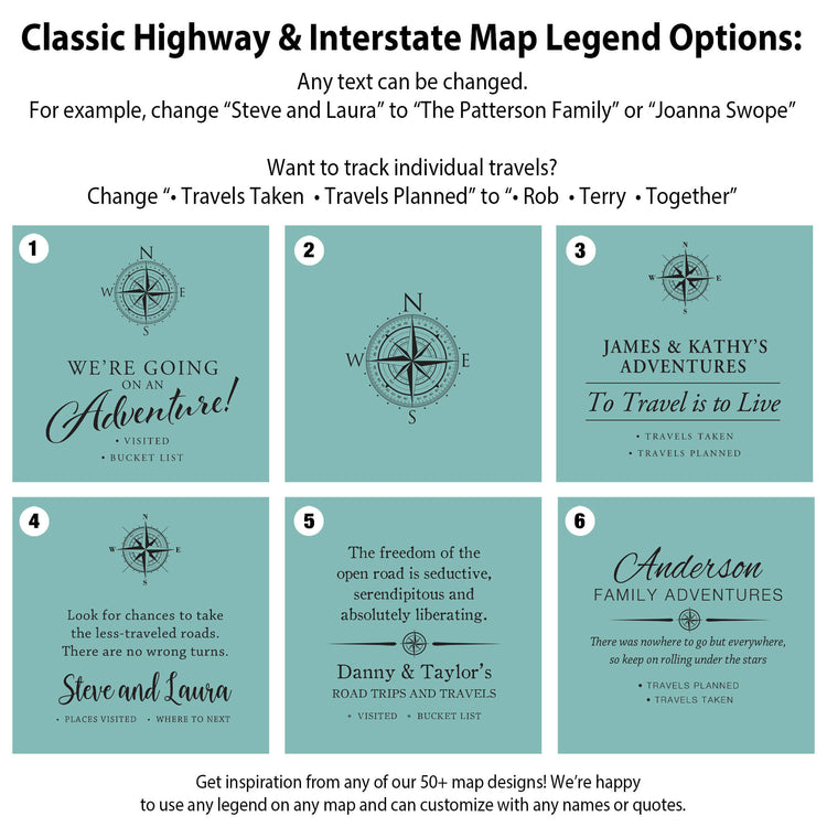 Track your travels on this pinnable US map with highways and interstates. United States map with pins is perfect for reminiscing about past adventures and planning your next road trip. Map can be customized with names and quotes to create a truly one-of-a-kind keepsake. Legend options can be personalized to track individual or family travels. Swipe through additional photos to see personalization options & close-up details.