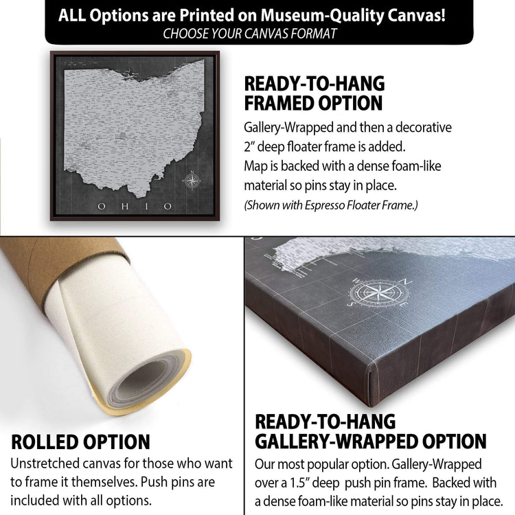 Grey Ohio State Push Pin Map allows you to pin the places you have traveled or have lived in Ohio. Or Simply use as beautiful as wall art showcasing your state pride. Great conversation starter. Superb clarity with abundant city and towns. Holy Cow! "NO CHARGE" for personalization. Makes a great wedding, anniversary, new home or graduation gift to commemorate one's roots for a truly custom gift. Highly detailed map features roads, highways, interstates, rivers, lakes along with National Parks & Forests, and military sites. Our Ohio Map is gallery-wrapped with a "premium" canvas--better than your box-store quality. Foam-like material under canvas ensures pins stay in place. Lightweight, Easy & ready-to-hang; no additional framing necessary; however, a Rolled option is available for those who want to frame map themselves (DIY). Made in the USA!