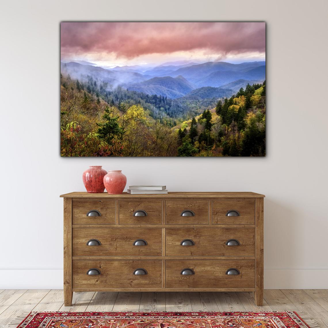 Blue Ridge Mountains Sensational Scenic Landscape Photo on Canvas. Travel from Smoky Mountain National Park to Shenandoah National Park, and you'll find some of the most scenic Mountain views and landscapes in America along the Blue Ridge Parkway. Rare photo moment was taken before sunset along the journey. Various sizes available on canvas including up to 94" wide. Black and White version is available by request.