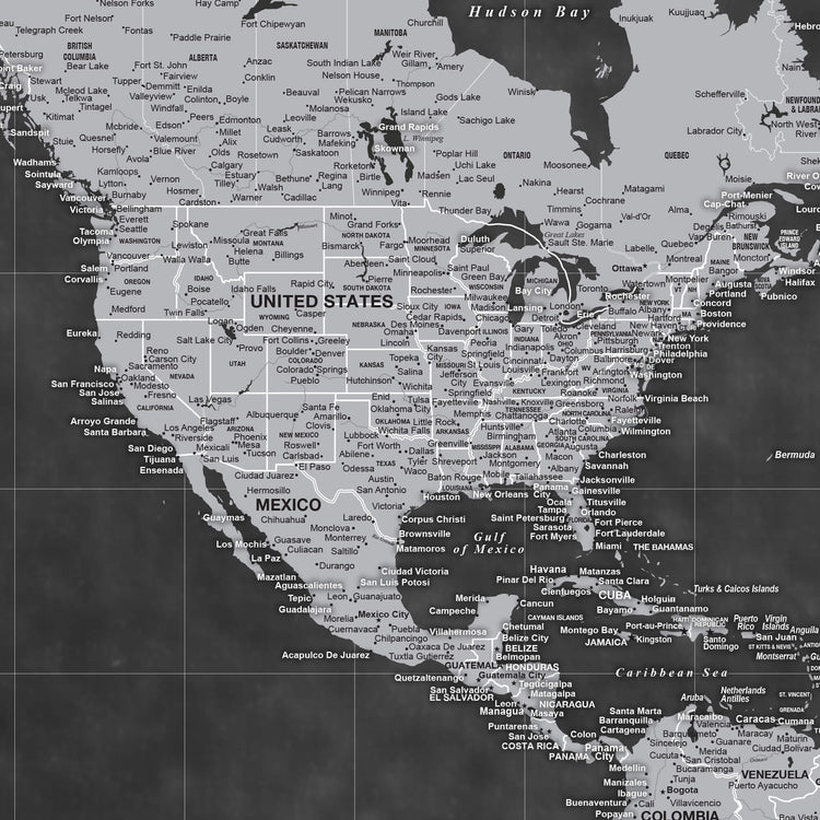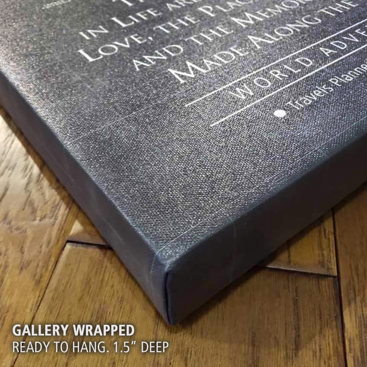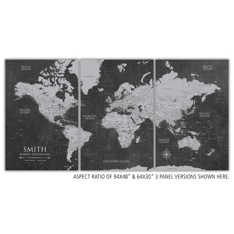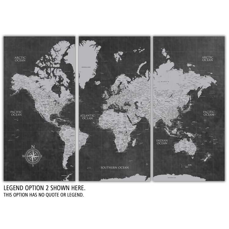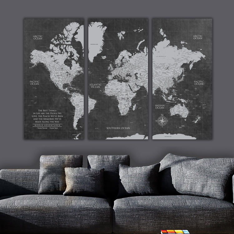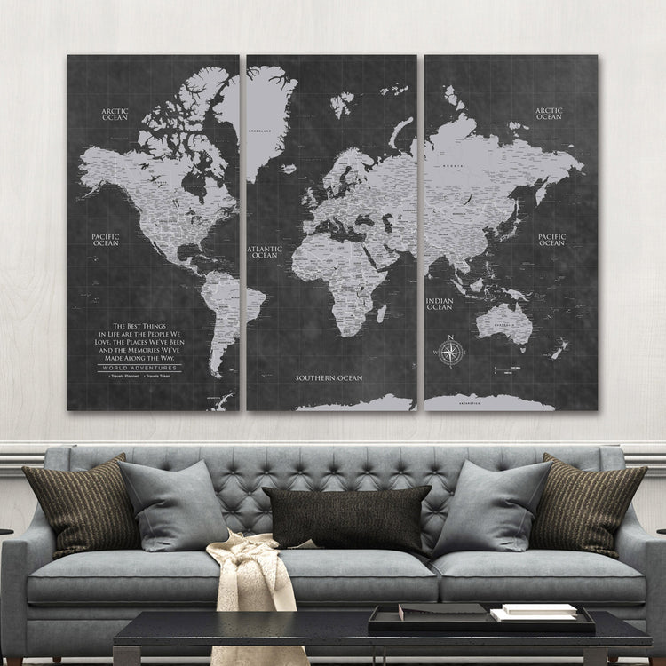 Grey World Push Pin Travel Map has unlimited custom quote and legend options. Map coordinates with most decor styles, traditional, modern or classic. Choose from a variety of sizes up to 94" wide! Great clarity, excellent city and country detail. Gallery wrapped and framed map is READY to HANG. Foamlike backing under special, blended canvas ensures your pins stay intact.
