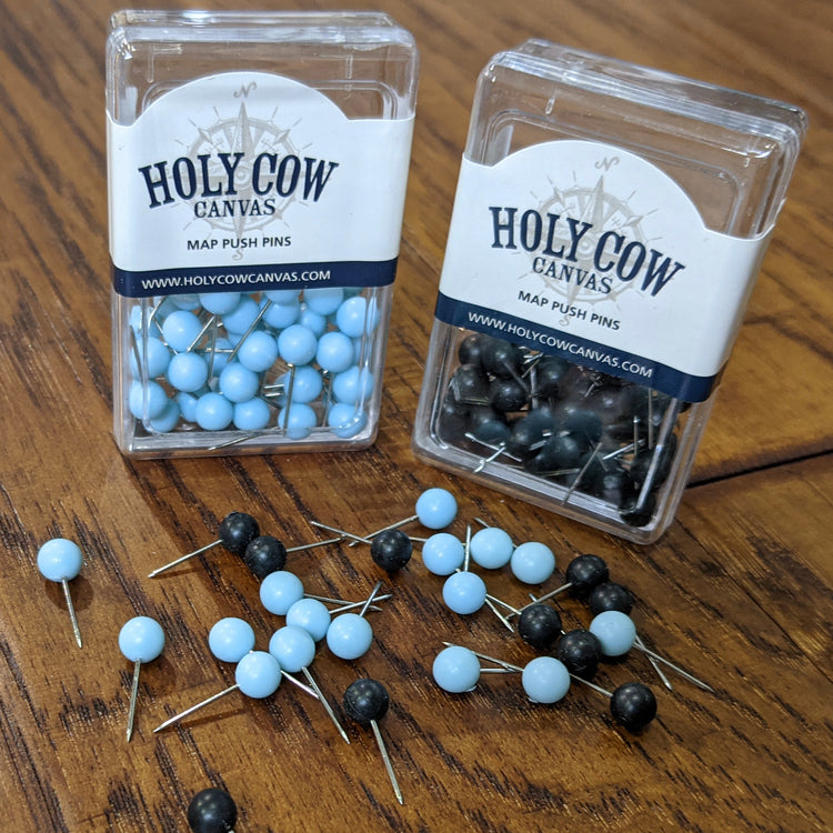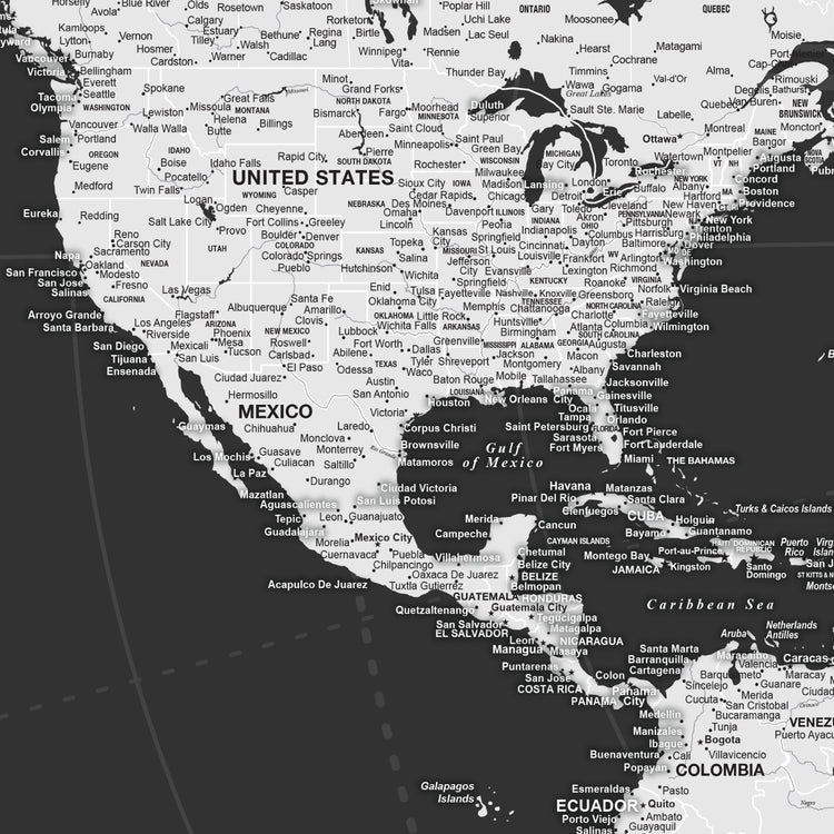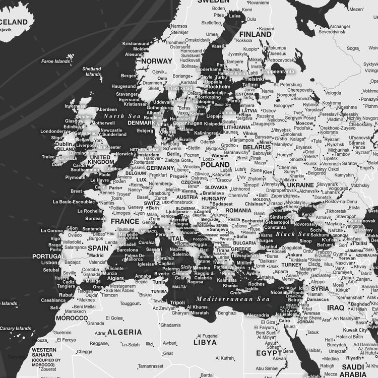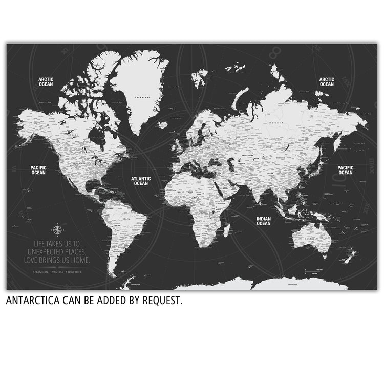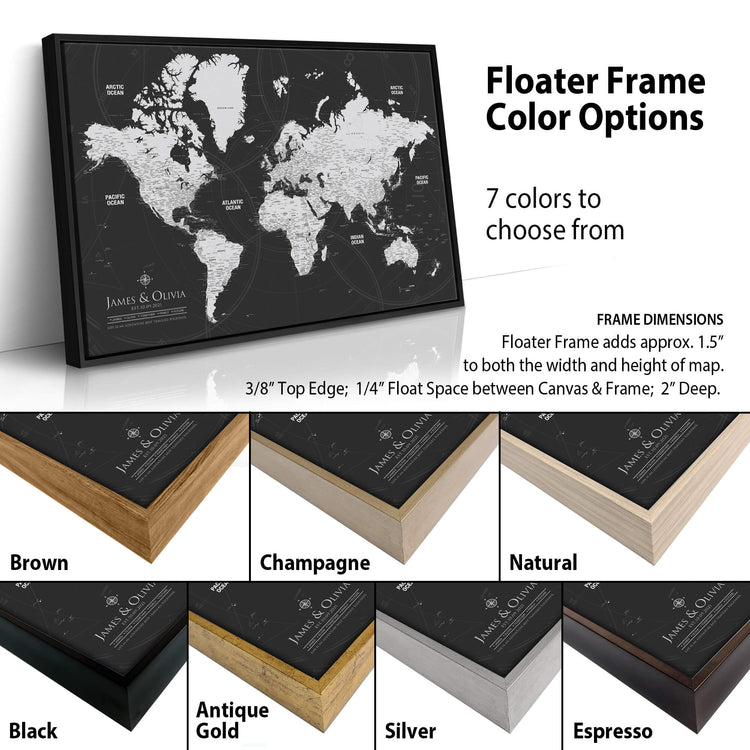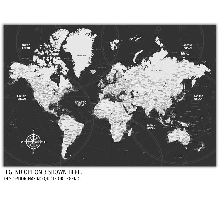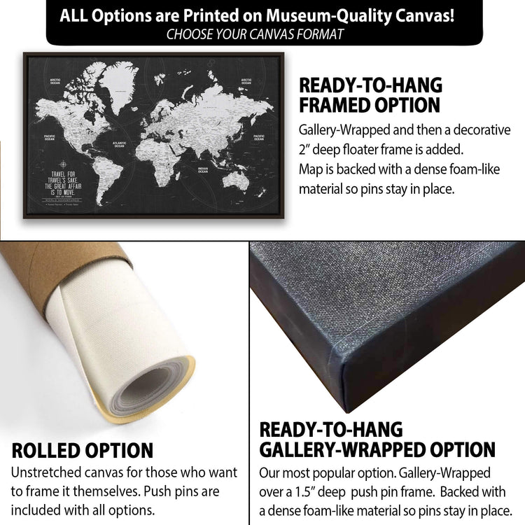 Modern Charcoal Grey, World Push Pin Travel Map. Great clarity with excellent city and country details, map is READY to HANG. No additional framing necessary. Foam-like backing under our special, blended canvas ensures your pins will stick and stay intact.