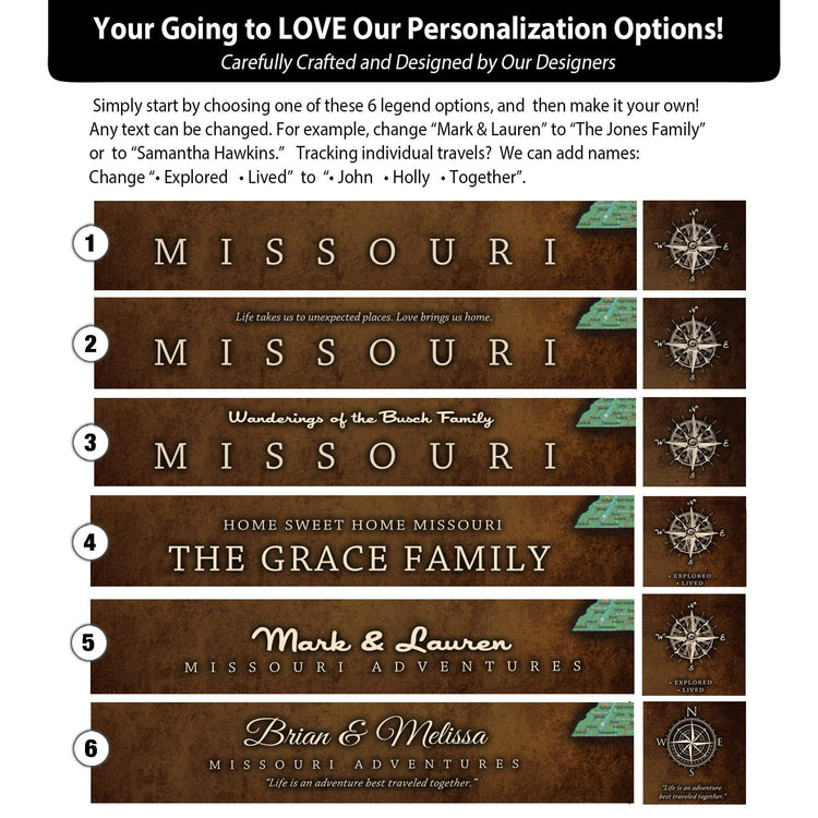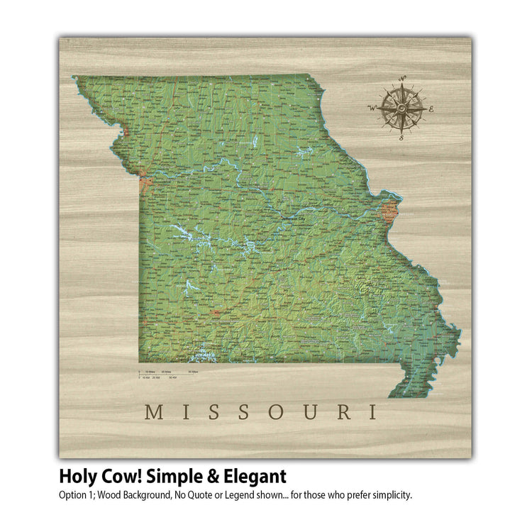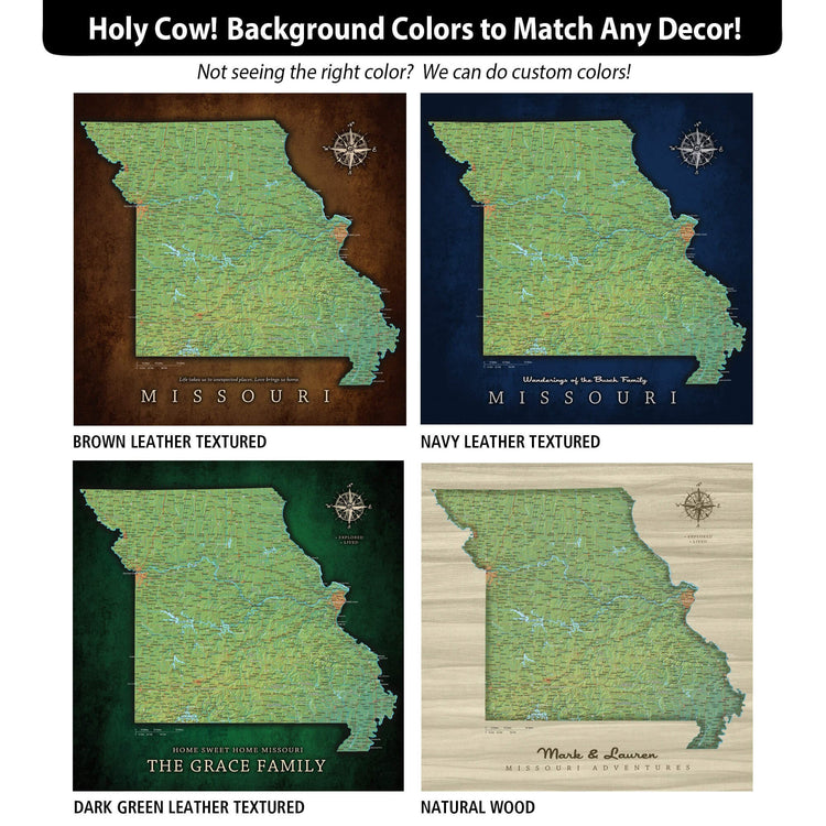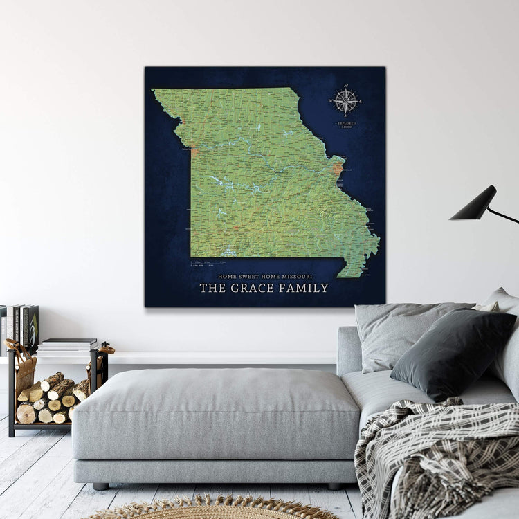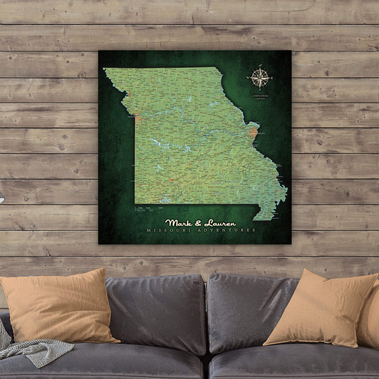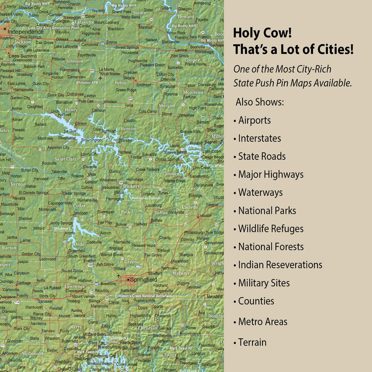 Our Missouri State Push Pin Map with Terrain lets you pin the places you traveled or lived in Missouri. Beautiful as wall art showcasing your state pride but fun to start conversations about your favorite places traveled. Superb clarity with more city and towns. Holy Cow! "NO CHARGE" for personalization to Make for an Extra Special wedding, anniversary, new home or graduation gift to commemorate one's roots. Map is highly detailed and features roads, highways, interstates, rivers, lakes along with National Parks & Forests, and military sites. Our Missouri Map is gallery-wrapped with a "premium" canvas--better than any box-store quality. Foam-like material under canvas ensures pins stay in place. Easy, lightweight and ready-to-hang; no additional framing necessary, however, a rolled option is available for those who want to frame map themselves (DIY). Made in the USA!