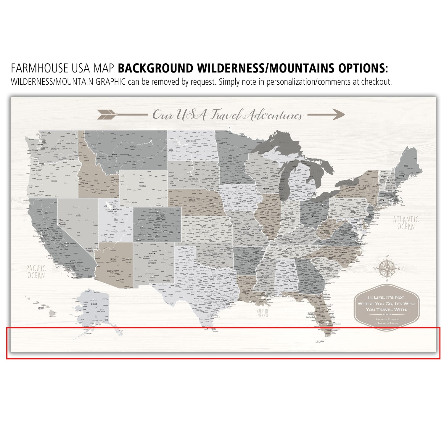 Our Farmhouse Push Pin USA Map is both beautiful modern farmhouse wall art AND a push pin map to track travels taken and travels planned. Map features a whitewash wood grain background with farmhouse grey, taupe, and white colors on a premium stretched canvas. Makes a great wedding, new home or gift for the traveler and can be personalized for a truly unique gift. This Travel Push Pin USA map will be a true conversation starter at your next party. Excellent clarity and highly detailed cities. EASY to & READY to HANG - no additional framing necessary. Foam-like backing ensures pins stay intact. The perfect gift for any traveler. Map includes National Parks.