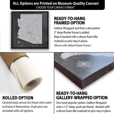 Our Grey Arizona State Push Pin Map allows you to pin the places you have traveled or have lived in Arizona. Beautiful as wall art showcasing your state pride but fun to start conversations. Superb clarity with abundant city and towns. Holy Cow! "NO CHARGE" for personalization. Makes a great wedding, anniversary, new home or graduation gift to commemorate one's roots for a truly custom gift. Highly detailed map features roads, highways, interstates, rivers, lakes along with National Parks & Forests, and military sites. Our Arizona Map is gallery-wrapped with a "premium" canvas--better than your box-store quality. Foam-like material under canvas ensures pins stay in place. Lightweight, Easy & ready-to-hang; no additional framing necessary, however Rolled option is available for those who want to frame map themselves (DIY). Made in the USA!