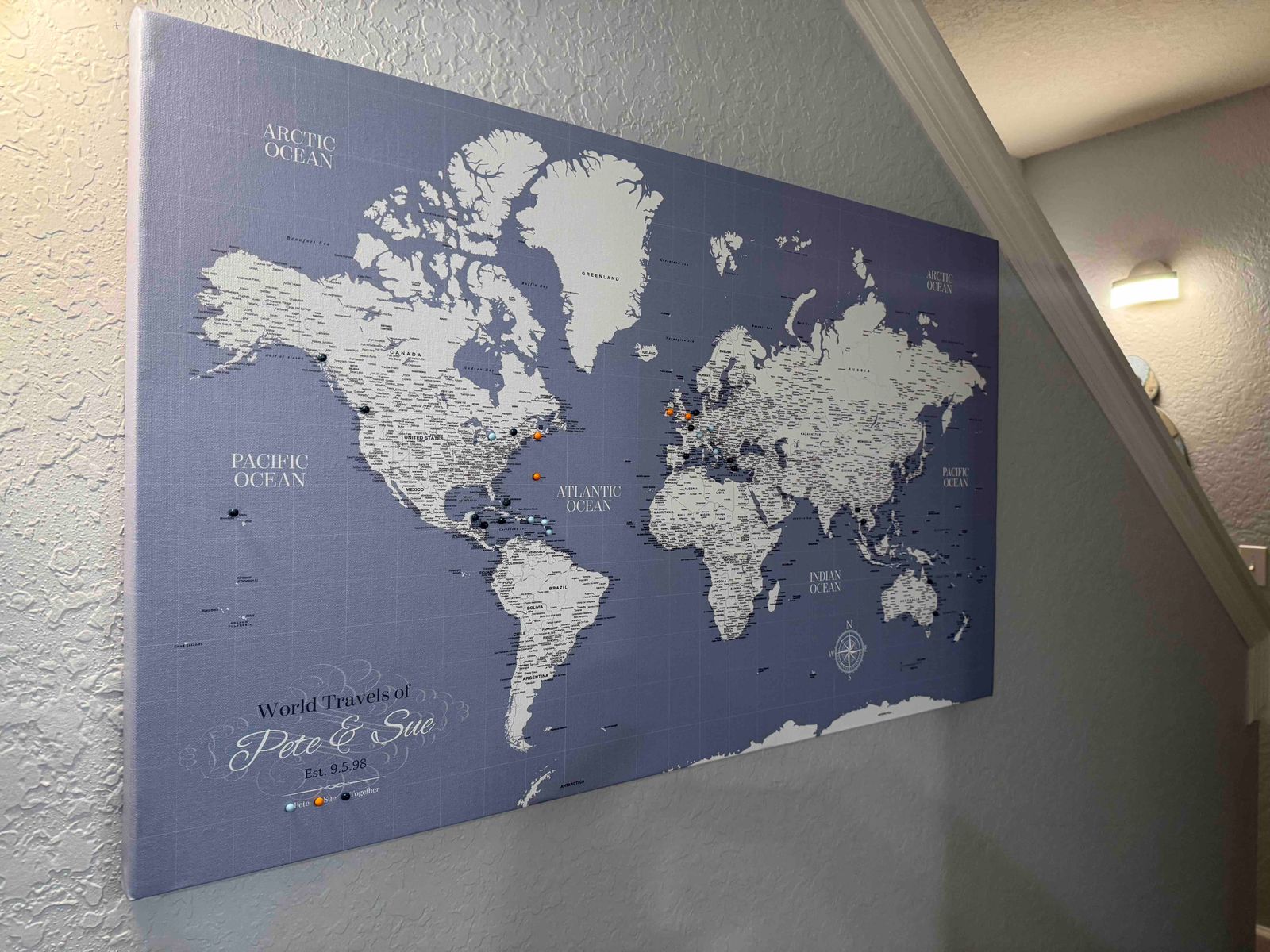 I ordered first for wedding anniversary for my nephew and his bride. They loved it so much. So I decided to buy one for myself. Can't wait to add more travel pins to my gorgeous map. 😍 Love. Love. Love ♥️
