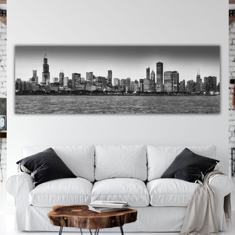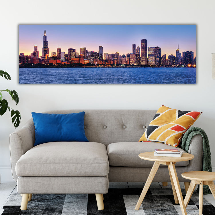 Chicago Downtown Skyline on Canvas, beautiful panoramic artwork makes it easy to fill or freshen your walls in your home or office. Three panel canvas set as shown is more than 7 1/2' wide!