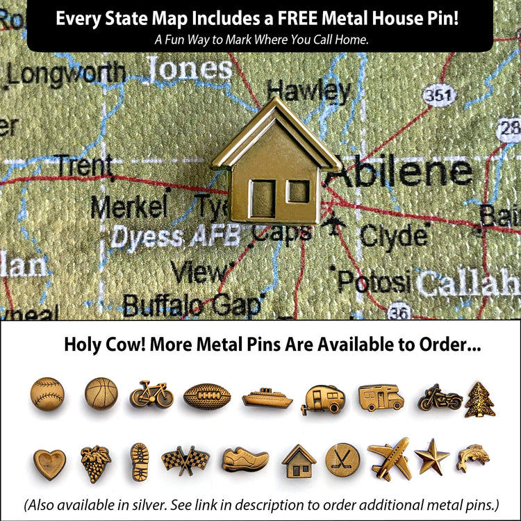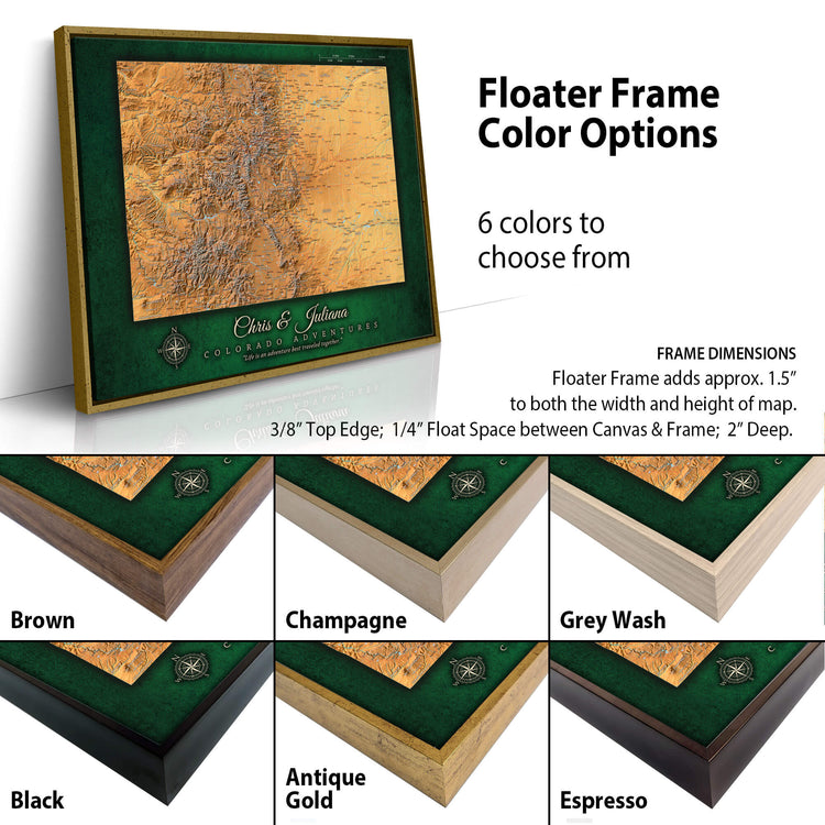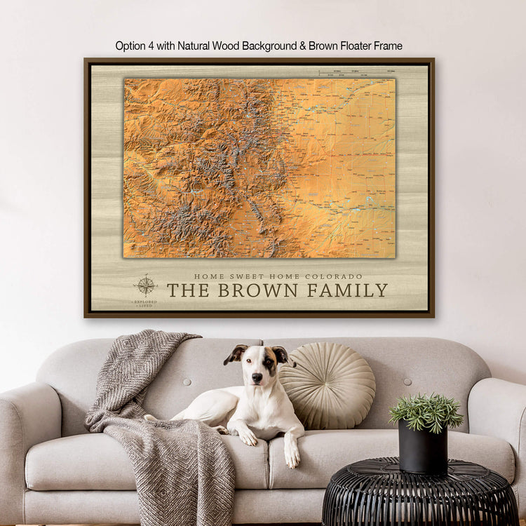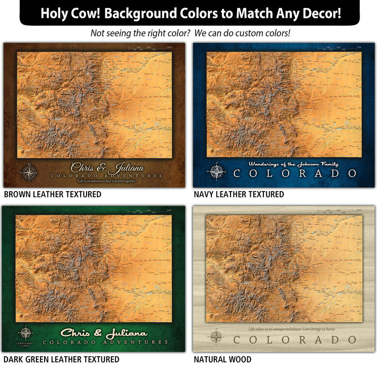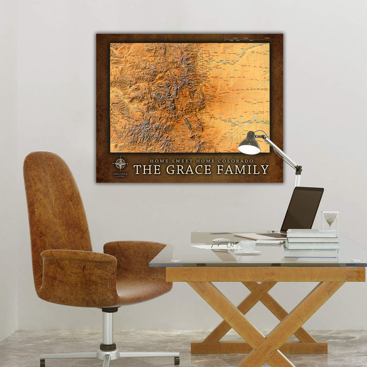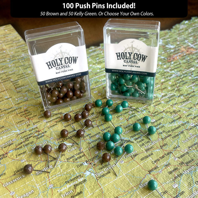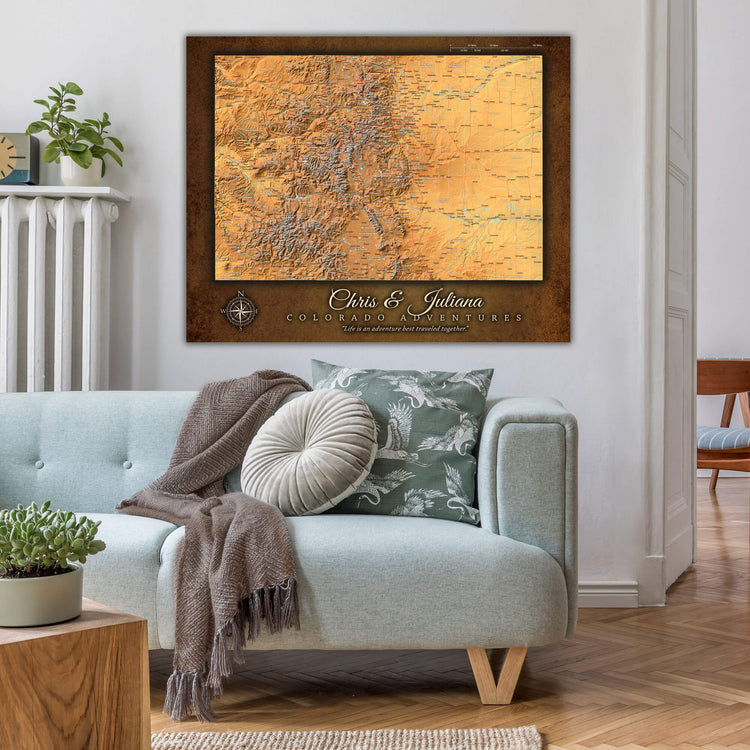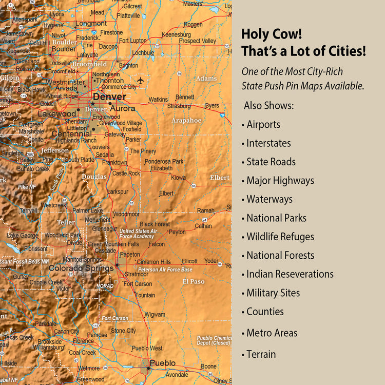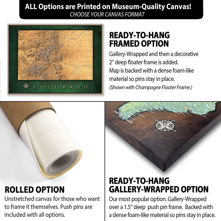 Our Colorado Push Pin Map with Terrain allows you to pin the places you have traveled or have lived in Colorado. Beautiful as wall art showcasing your state pride but fun to start conversations about your favorite places traveled. Superb clarity with abundant cities and towns. Makes a great wedding, anniversary, new home or graduation gift to commemorate one's roots, and is customizable for a truly personal gift. Available in 4 background color options to coordinate with most decors. Highly detailed, map features roads, highways, interstates, rivers, lakes along with National Parks & Forests, and military sites. Colorado State map is gallery-wrapped with a premium canvas; foam-like material under canvas ensures pins stay in place. Easy and ready-to-hang; no additional framing necessary.
