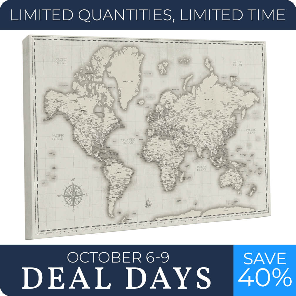 Cream World Push Pin Travel Map showcases a collection of up-to-date countries while maintaining a classic Old World charm. It offers superb clarity with detailed representations of cities and countries. Easy-to and ready-to hang; no additional framing necessary. Foam-like backing ensures pins stay intact. The perfect gift for any traveler. Map measures 40" x 24"