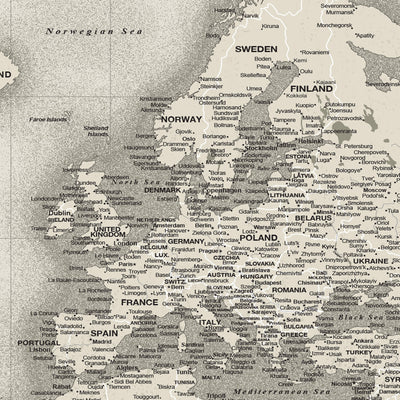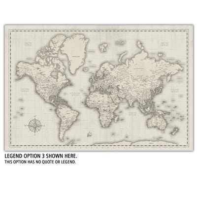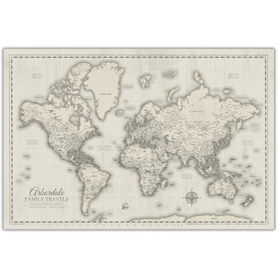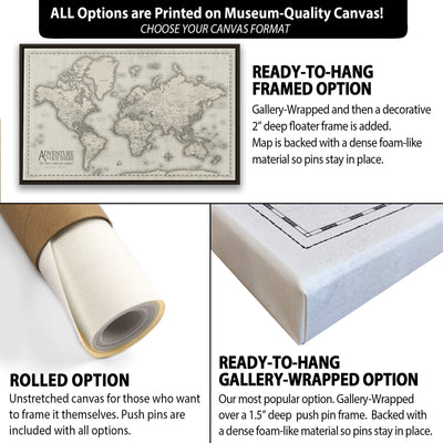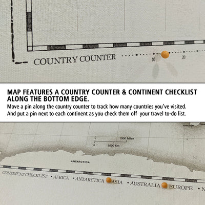 Cream World Push Pin Travel Map showcases a collection of up-to-date countries while maintaining a classic Old World charm. It offers superb clarity with detailed representations of cities and countries. The gallery-wrapped canvas is backed with a foam-like material that keeps pins securely in place. Our premium canvas also conceals pinholes if you choose to remove or change the pins. Be sure to swipe through the additional photos to explore personalization options and close-up details. This map is easy to hang and comes ready for display—no additional framing is necessary.