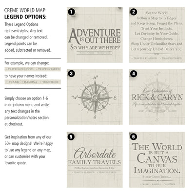 The map can be fully customized. Choose from the quote & legend options shown. Type your custom text in the “Personalize Your Canvas’ field.