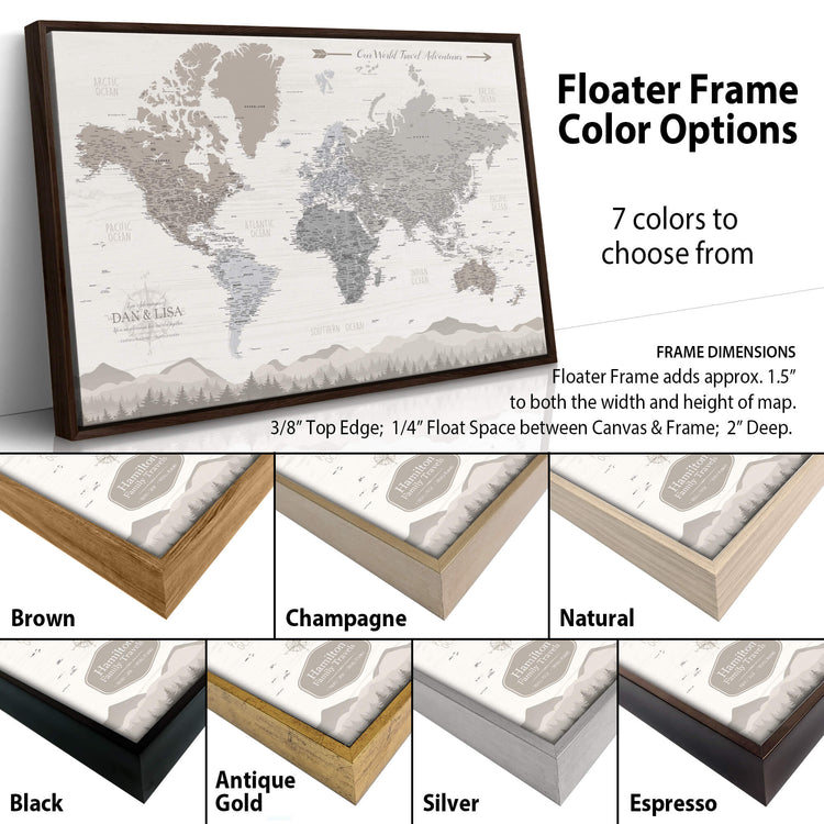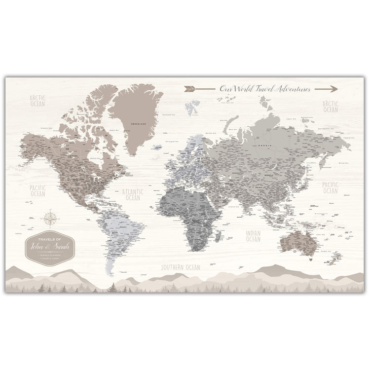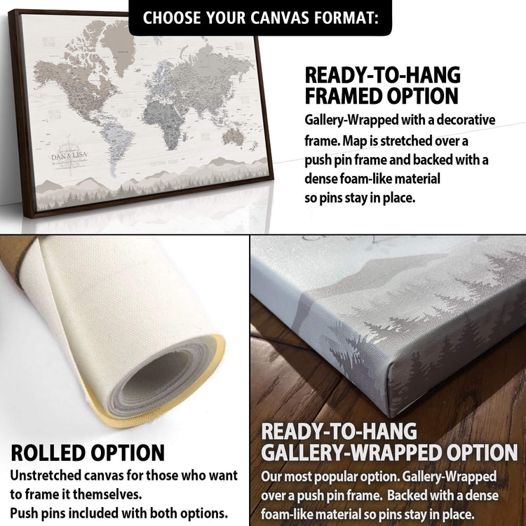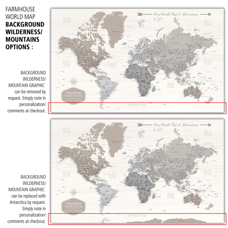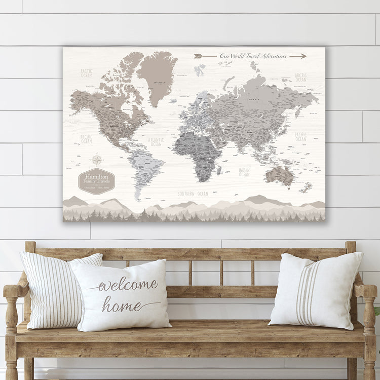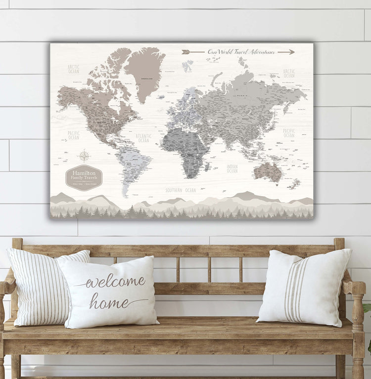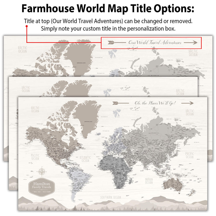 Our Farmhouse Personalized Push Pin World Map doubles as beautiful modern farmhouse decor AND a push pin map of the world to track travels taken and travels planned. Map features a whitewash wood grain background perfect for your grey, taupe and white farmhouse decor. Personalized quotes and legends make this a great wedding, new home or gift for the traveler. This travel push pin world map features excellent clarity and highly detailed cities. EASY to & READY to HANG - no additional framing necessary. Foam-like backing ensures pins stay intact.