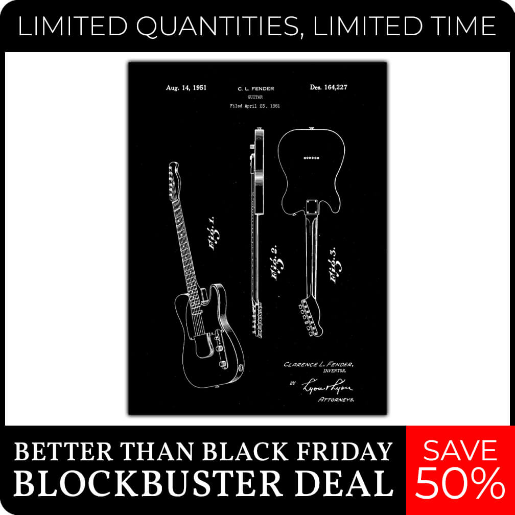 Fender Guitar Patent Art on Canvas. Stretched & Ready to hang using artist grade materials. No need to spend a fortune on custom framing. Unique art makes a great gift for any drummer, music lover or music room.