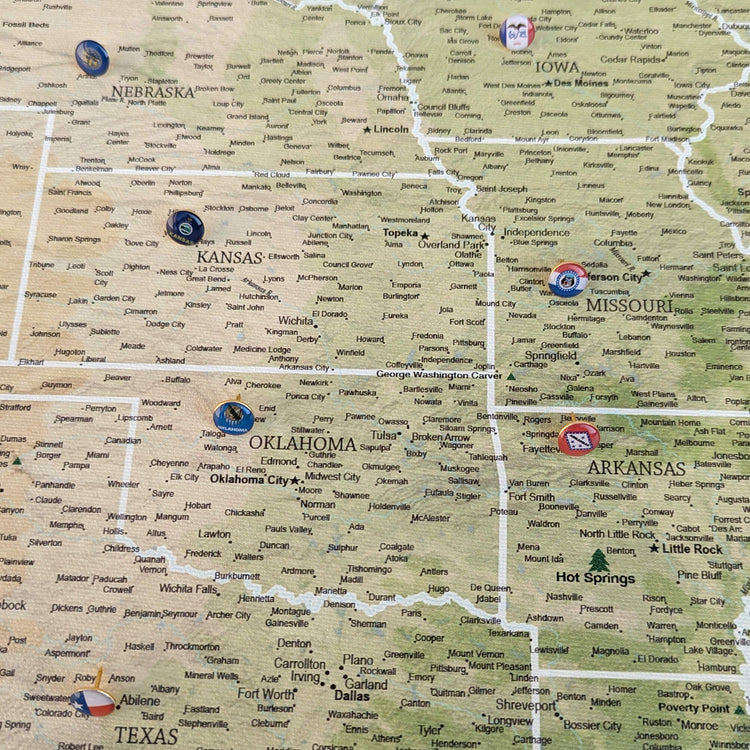 I use my map, the metal motorcycle, and colored, plastic pins to show my travels around the USA. My map is a focal point in our living space and I love the way folks are drawn to it and how it promotes conversations! I love my Holy Cow Map!!