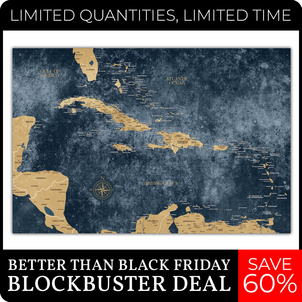 Our Gold & Navy Textured Caribbean Map brings classic nautical style with a dramatic flair to any room. Perfect for tracking your travels and planning where you're heading next. Plus, keep count of how many countries and continents you've visited with the trackers along the bottom edge. Easy-to and ready-to hang; no additional framing necessary. Foam-like backing ensures pins stay intact. The perfect gift for any traveler. Map measures 24" x 16"