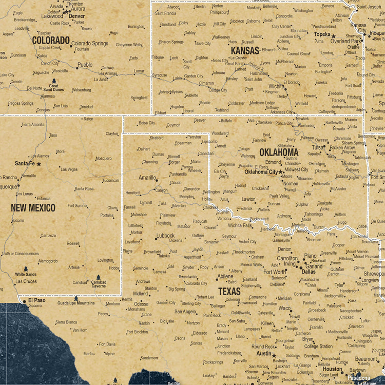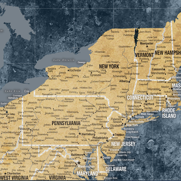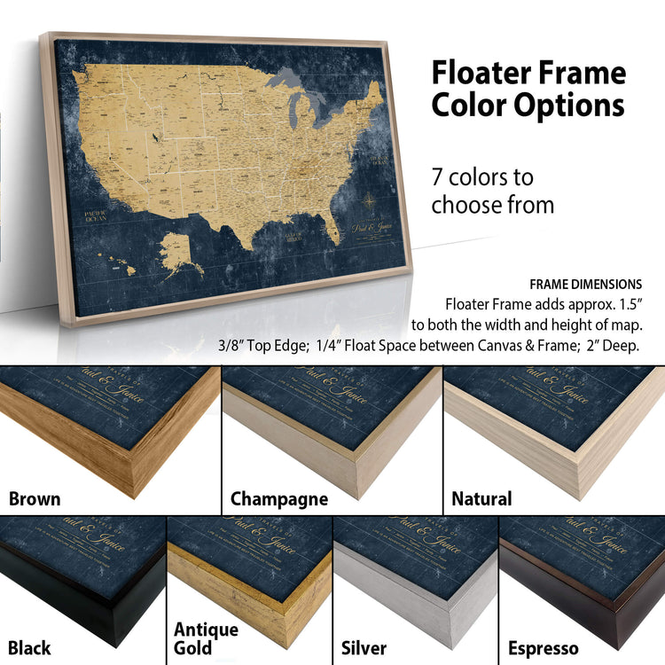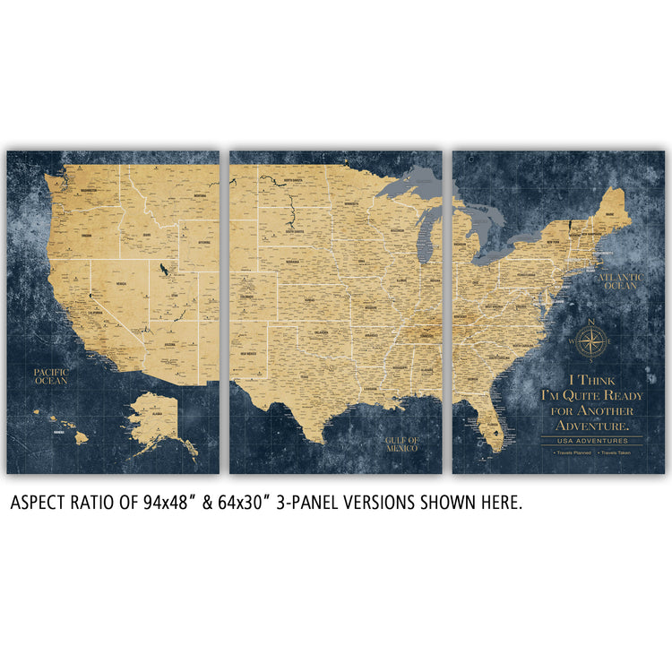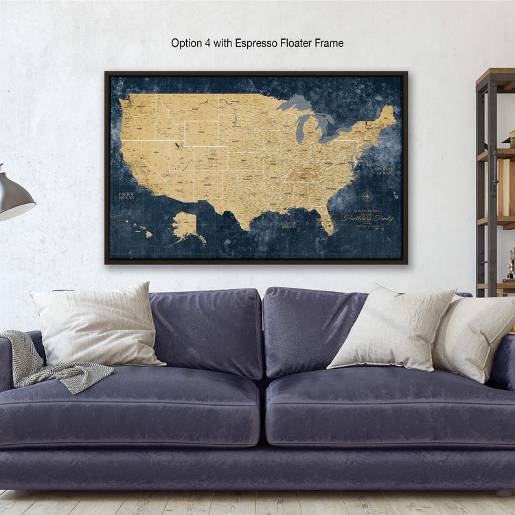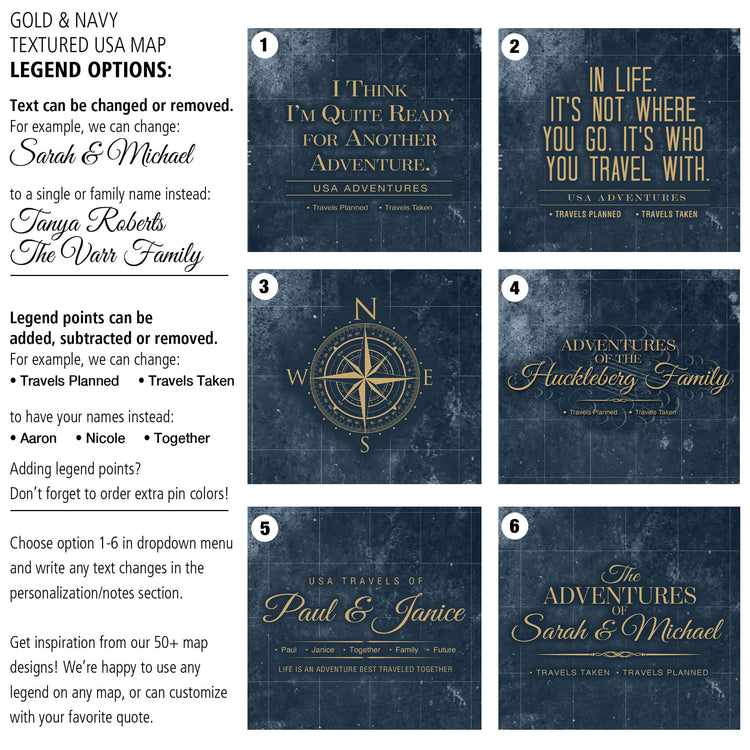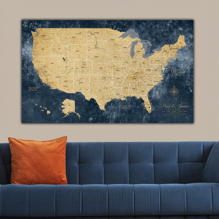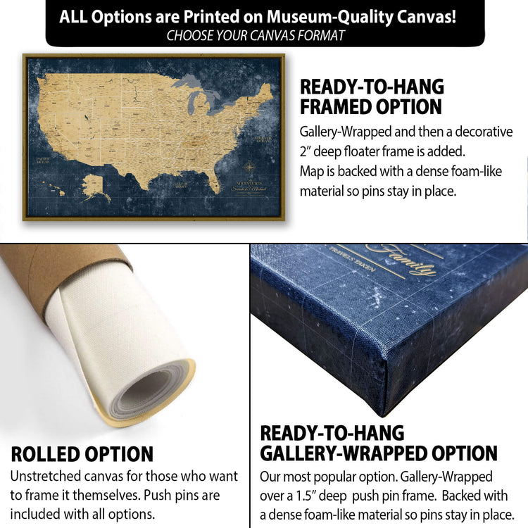 Record your travels and plan upcoming trips with this highly detailed Push Pin Travel Map of the United States. The navy water and gold land have a textured look and the map is printed on premium canvas. Choose from 6 Legend Options (scroll through the photos for examples) or add Your Custom Quote. Great clarity! Ready-To-Hang versions need no additional framing. Foam-like backing under our special, blended canvas ensures your pins will stick and stay intact. Canvas hides pin holes if pins are taken out. Prefer to frame it yourself? Order a Rolled map option and finish it off however you like. Rolled maps include extra printed canvas to aid in the stretching/framing process. Photos of both Ready-to-Hang and Rolled versions are in the listing.